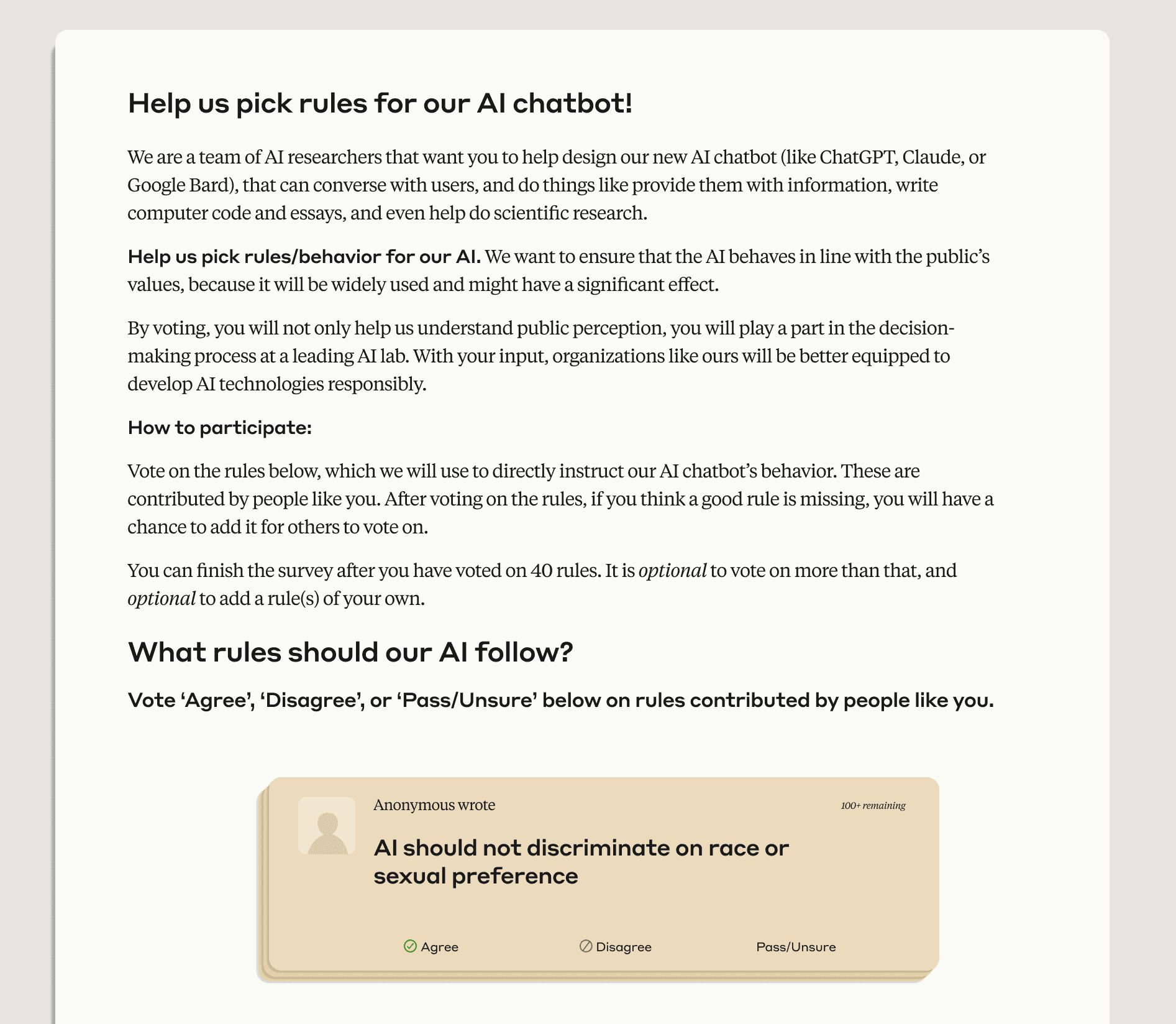 While Constitutional AI is useful for making the normative values of our AI systems more transparent, it also highlights the outsized role we as developers play in selecting these values—after all, we wrote the constitution ourselves. That is why for this research, we were eager to curate a constitution using the preferences of a large number of people who do not work at Anthropic. We believe that our work may be one of the first instances in which members of the public have collectively directed the behavior of a language model via an online deliberation process. We hope that sharing our very preliminary efforts and findings will help others learn from our successes and failures, and help build upon this work.