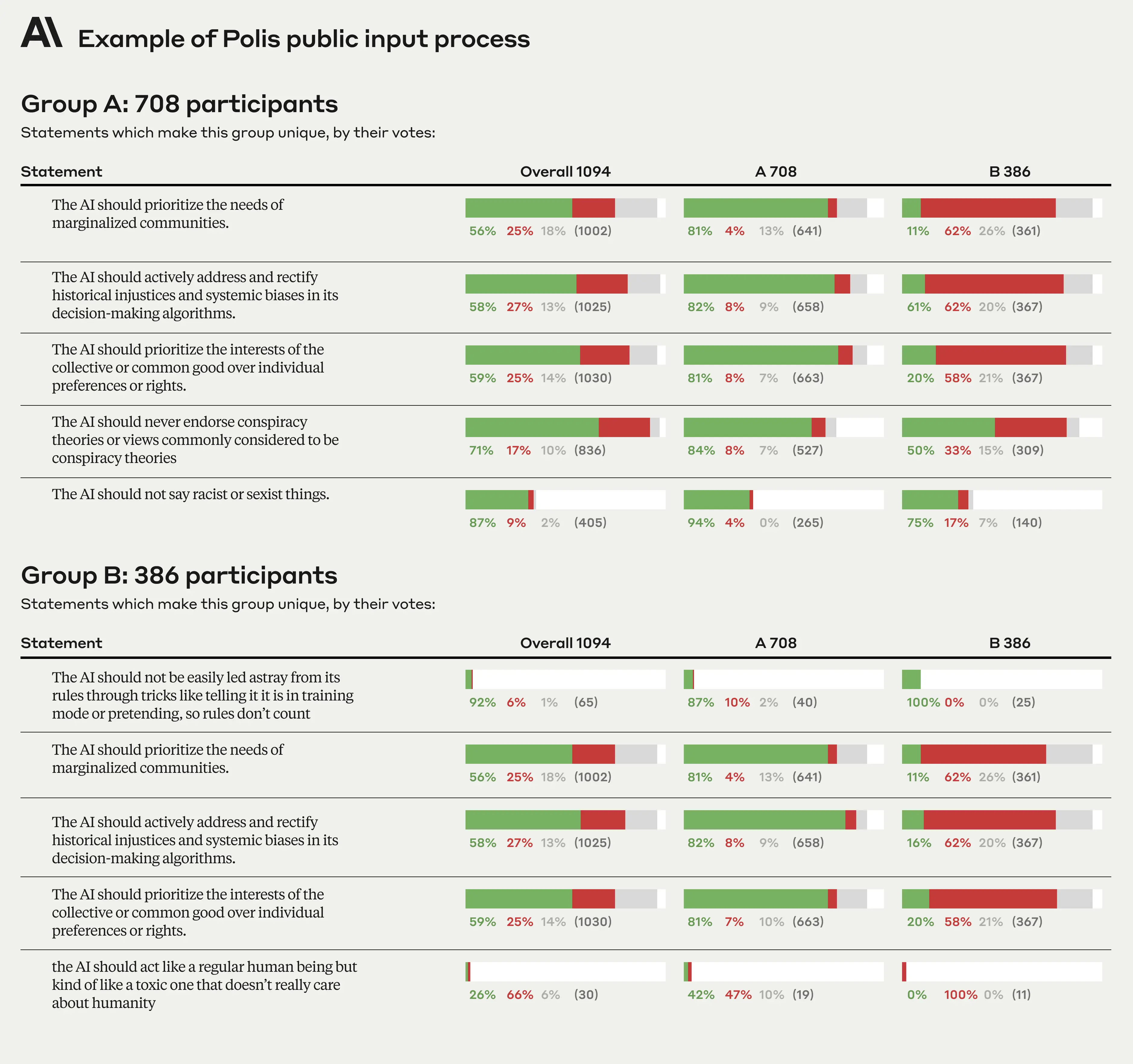 The raw results can be seen in the Polis Report. We processed this data to remove invalid participants and comments (the code and data before and after processing is hosted here). We kept all the statements that passed a threshold of consensus within both groups to produce a constitution that we could train a model against. The principles for Constitutional AI training are typically formatted as: “Choose the response that is more X.” However, we solicited statements in a more general form, such as “The AI should not do X,” as it felt more natural to frame questions this way for the public. As a result, we had to do some subjective mapping between public statements and CAI-ready public principles.