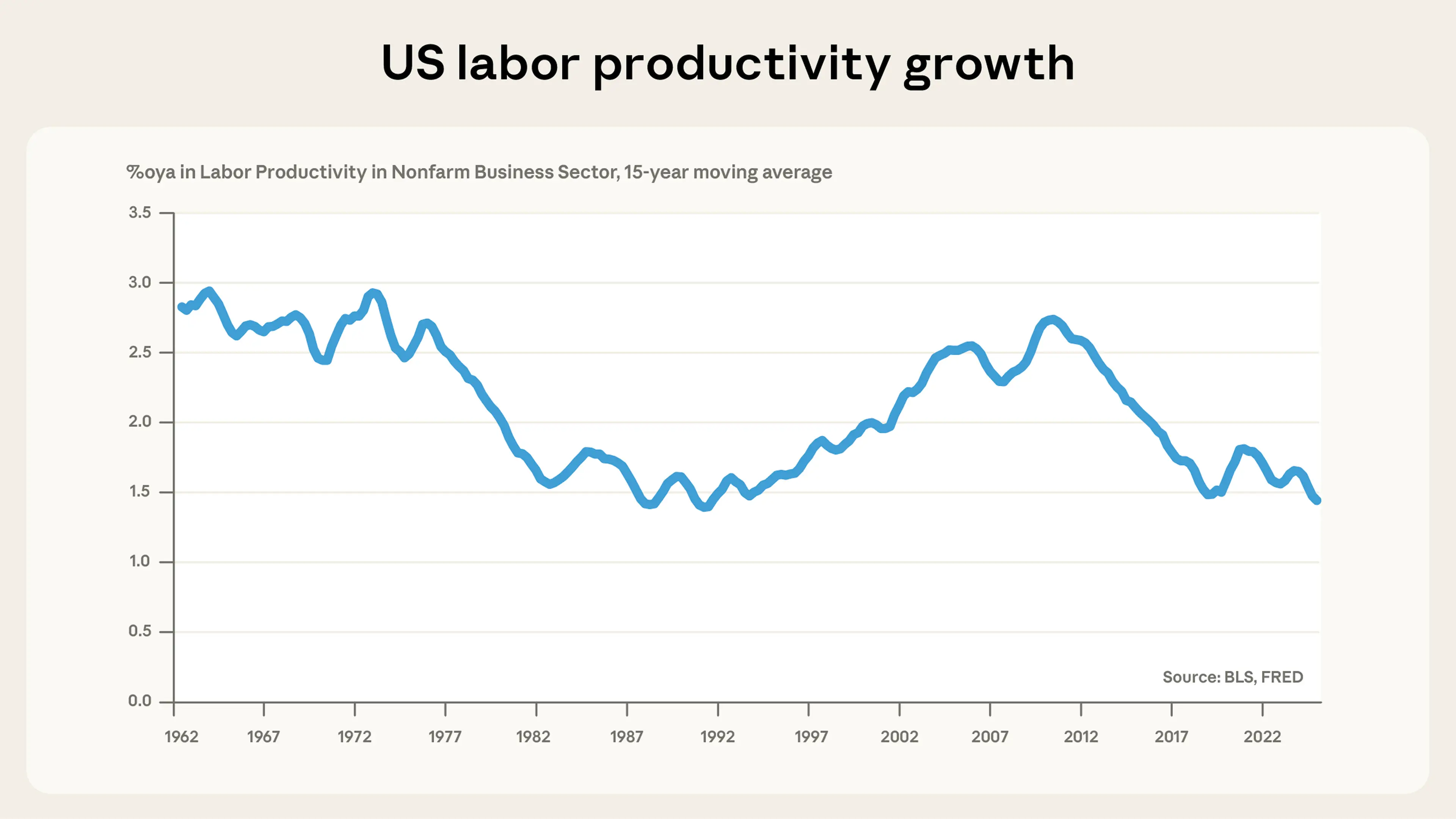 5. For historical data on total factor productivity see estimates from the Federal Reserve Bank of San Francisco: https://www.frbsf.org/research-and-insights/data-and-indicators/total-factor-productivity-tfp/. The average growth in TFP from 2015 to 2024 was 0.7%. Twenty years earlier, the average growth rate in TFP from 1995 to 2004 was 1.6%.