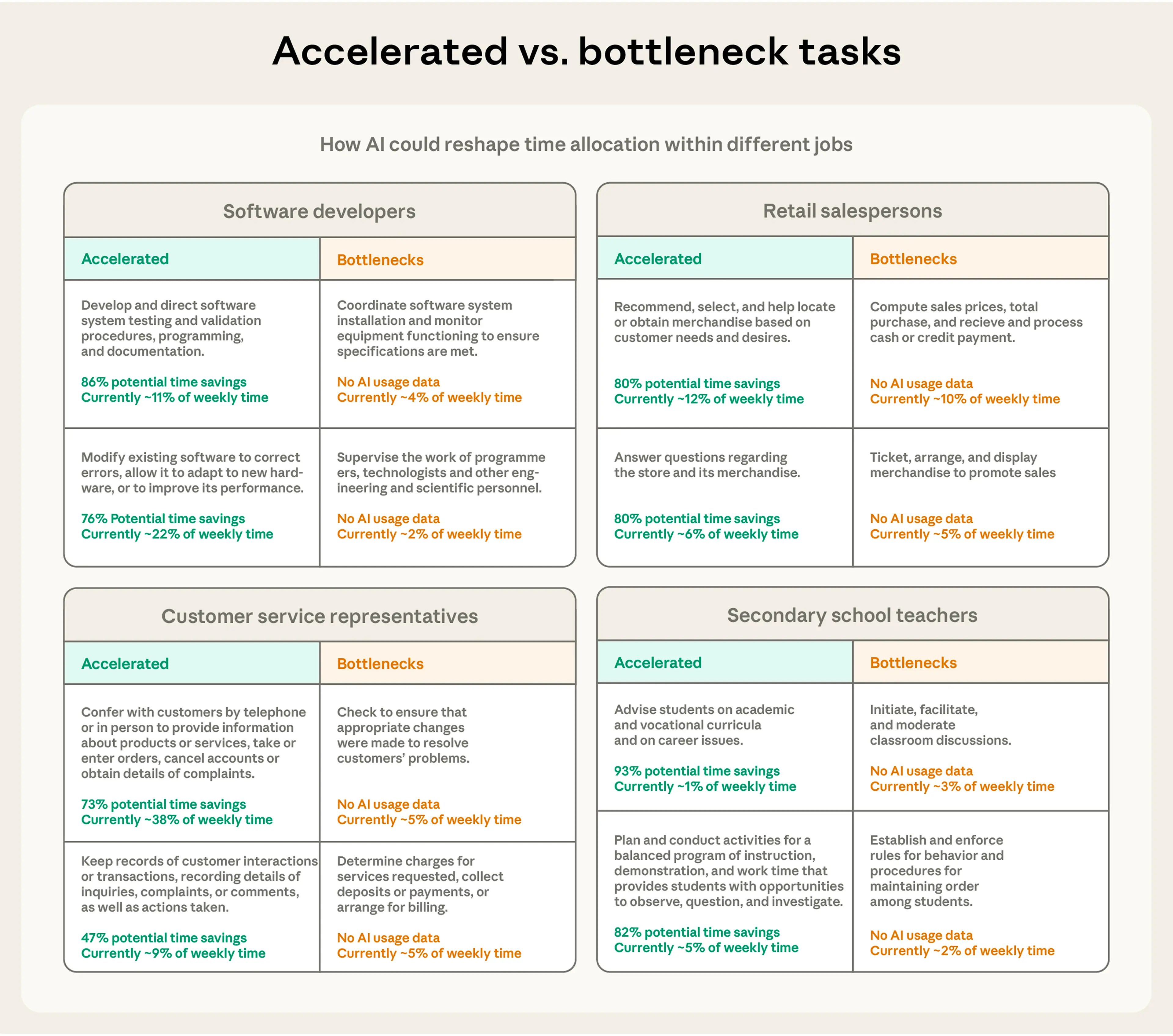 The figure below illustrates this for a few occupations. For software developers, AI speeds up the process of software development, testing, documentation, and manipulating data. But we do not currently see meaningful AI use for coordinating system installation or supervising the work of other technologists or engineers. For teachers, we see that AI assists with lesson and activity planning, but not with sponsoring extracurricular clubs or enforcing rules in the classroom.
