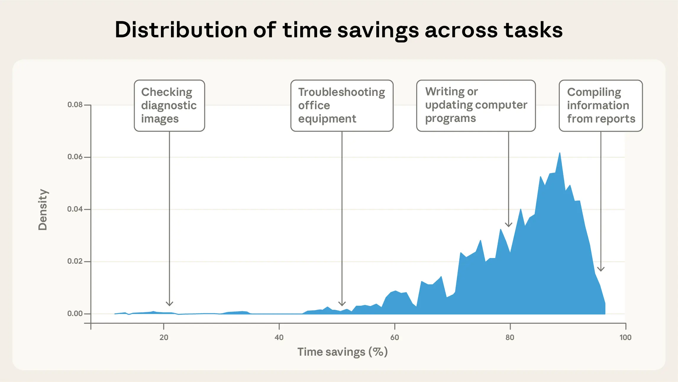 Our human time and cost estimates capture the magnitude of tasks people tackle with AI. But the time savings—Claude’s estimate for how much faster work gets done with AI—reflects the productivity gains that might come from using AI for those tasks.
