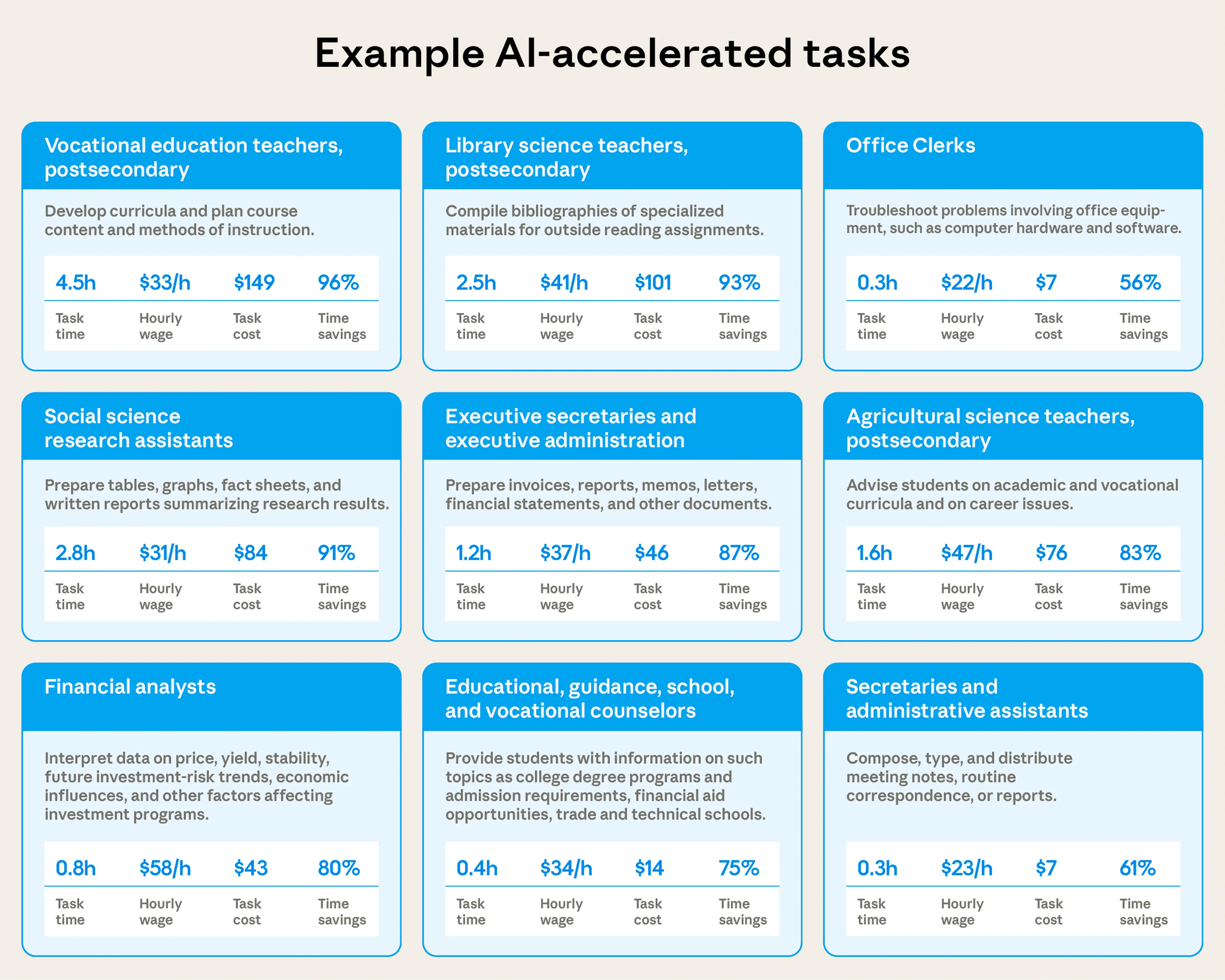 People also use AI to save 87% of the time it would take to write invoices, memos, and other documents (at least for the type of documents Claude is asked to handle). Finally, AI saves 80% of time on financial analyst tasks like interpreting financial data for tasks that would ordinarily cost $31 in wages.