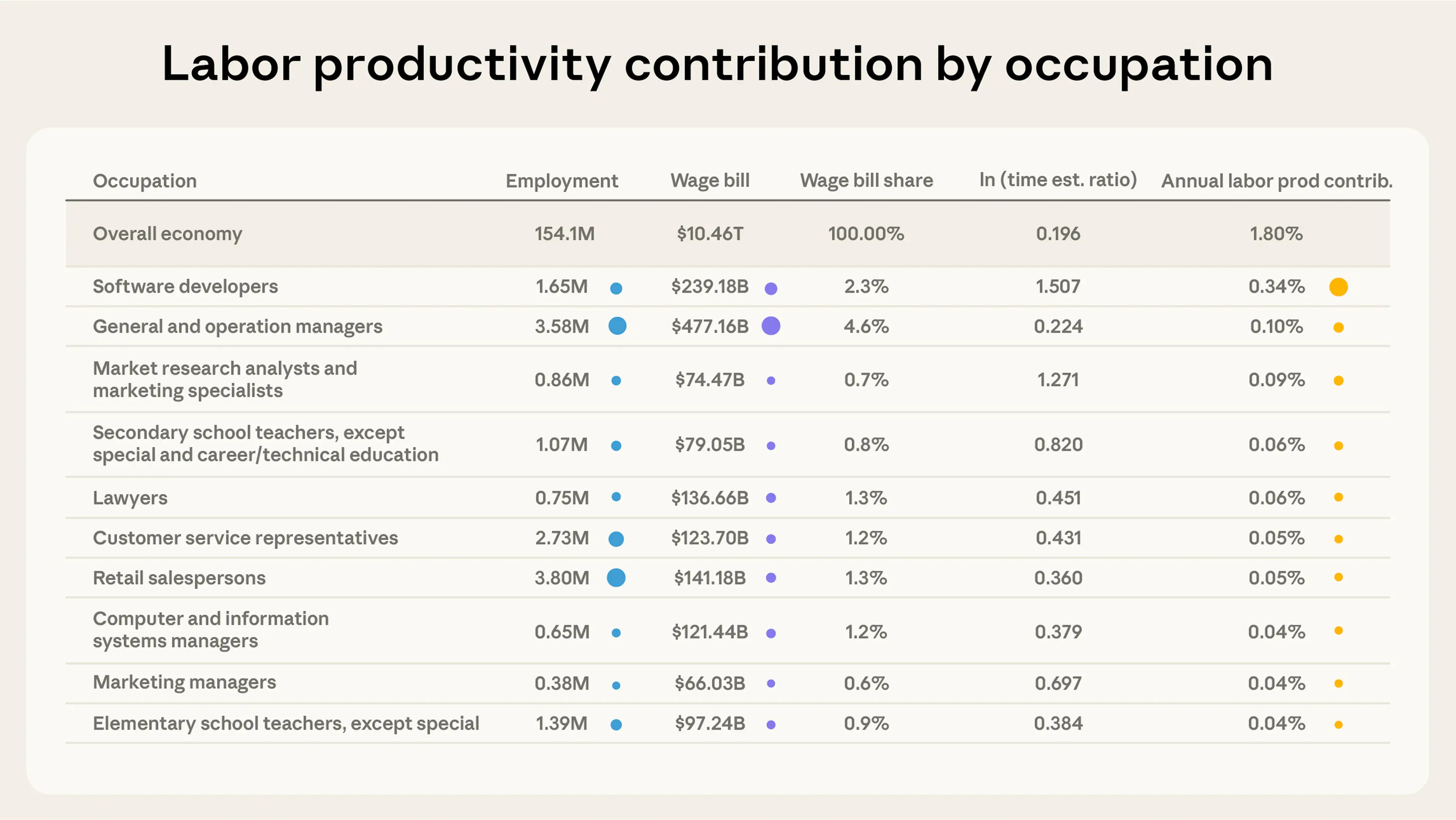 Reflecting the fact that some tasks and occupations appear much more frequently in our data than others, we observe similar phenomena in occupations’ contributions to labor productivity as well. Software developers contribute most (19%) to the total labor productivity gain attributable to AI. General and Operations Managers (about 6%), Market Research Analysts and Marketing Specialists (5%), Customer Service Representatives (4%) and Secondary School Teachers (3%) round out the top five.
