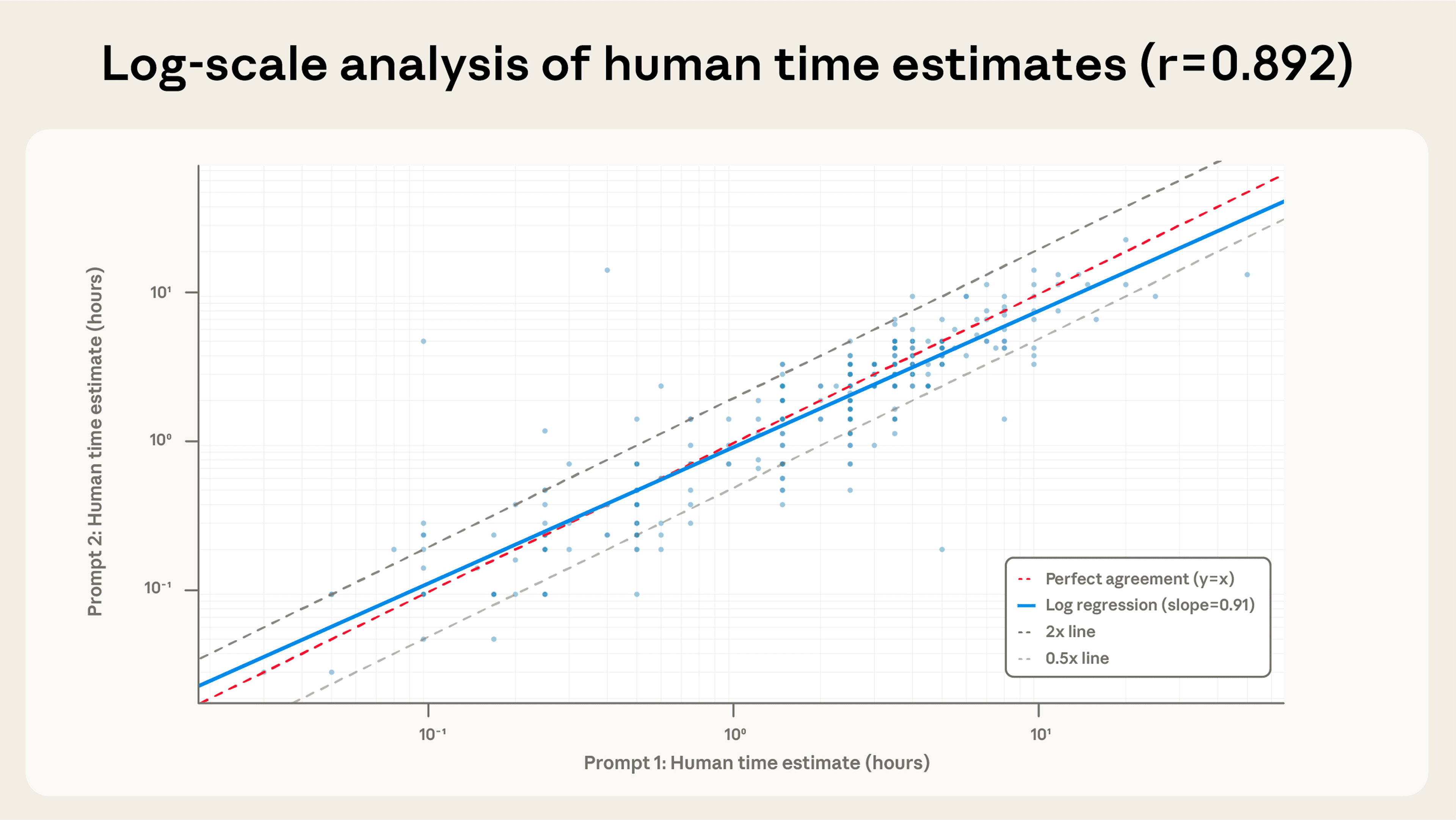 Estimating task duration is notoriously difficult for humans. AI models have an even more difficult job, since they lack crucial context about the broader context of tasks (though we expect this context to increase over time as features like memory and external integrations become more comprehensive). To assess whether Claude’s estimates are informative, we conducted two validation analyses.