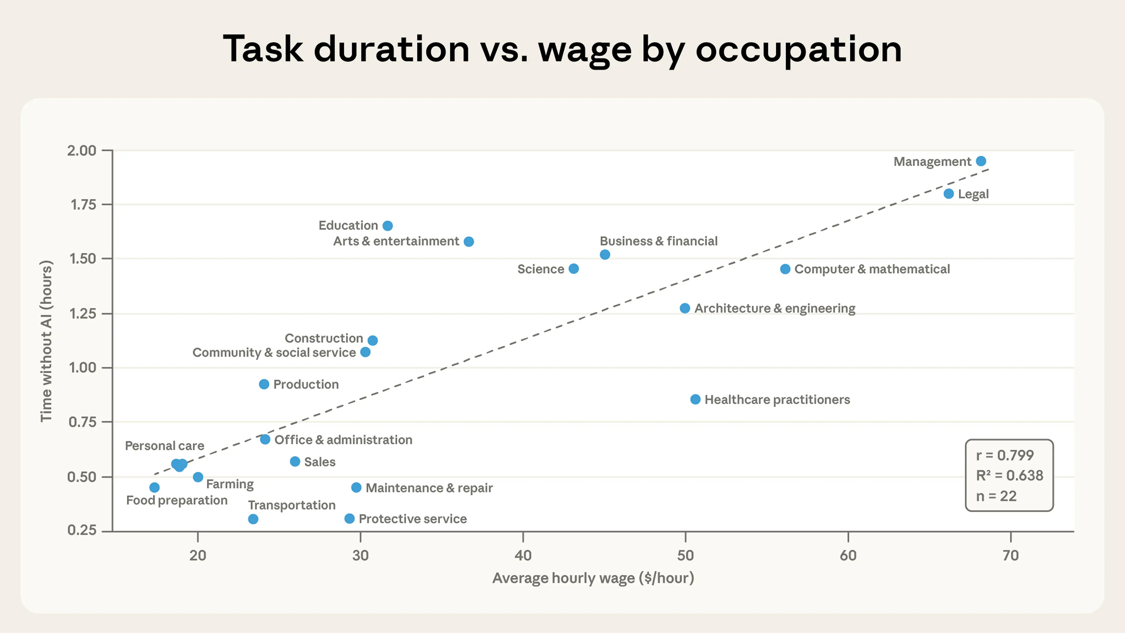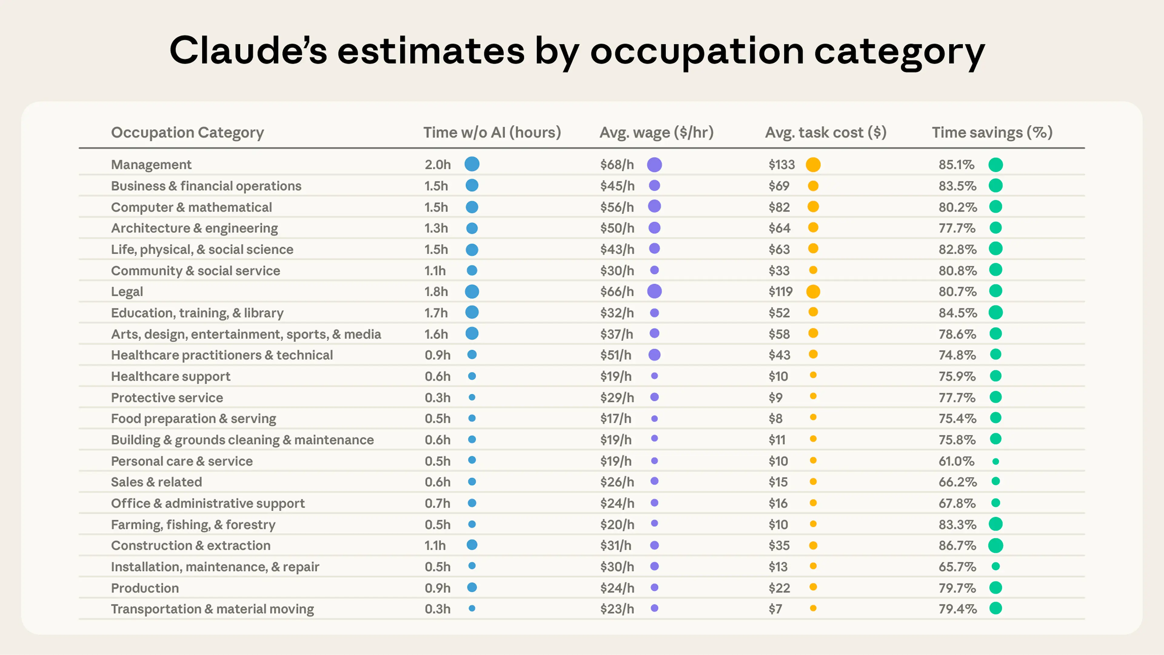 - The estimated scope, cost, and time savings of tasks varies widely by occupation. Based on Claude’s estimates, people use Claude for legal and management tasks that would have taken nearly two hours, but for food preparation tasks that would have taken only 30 minutes. And we find that healthcare assistance tasks can be completed 90% more quickly, whereas hardware issues see time savings of 56%. This doesn’t account for the time that humans might spend on these tasks beyond their conversation on Claude.ai, however, so we think these estimates might overstate current productivity effects to at least some degree.