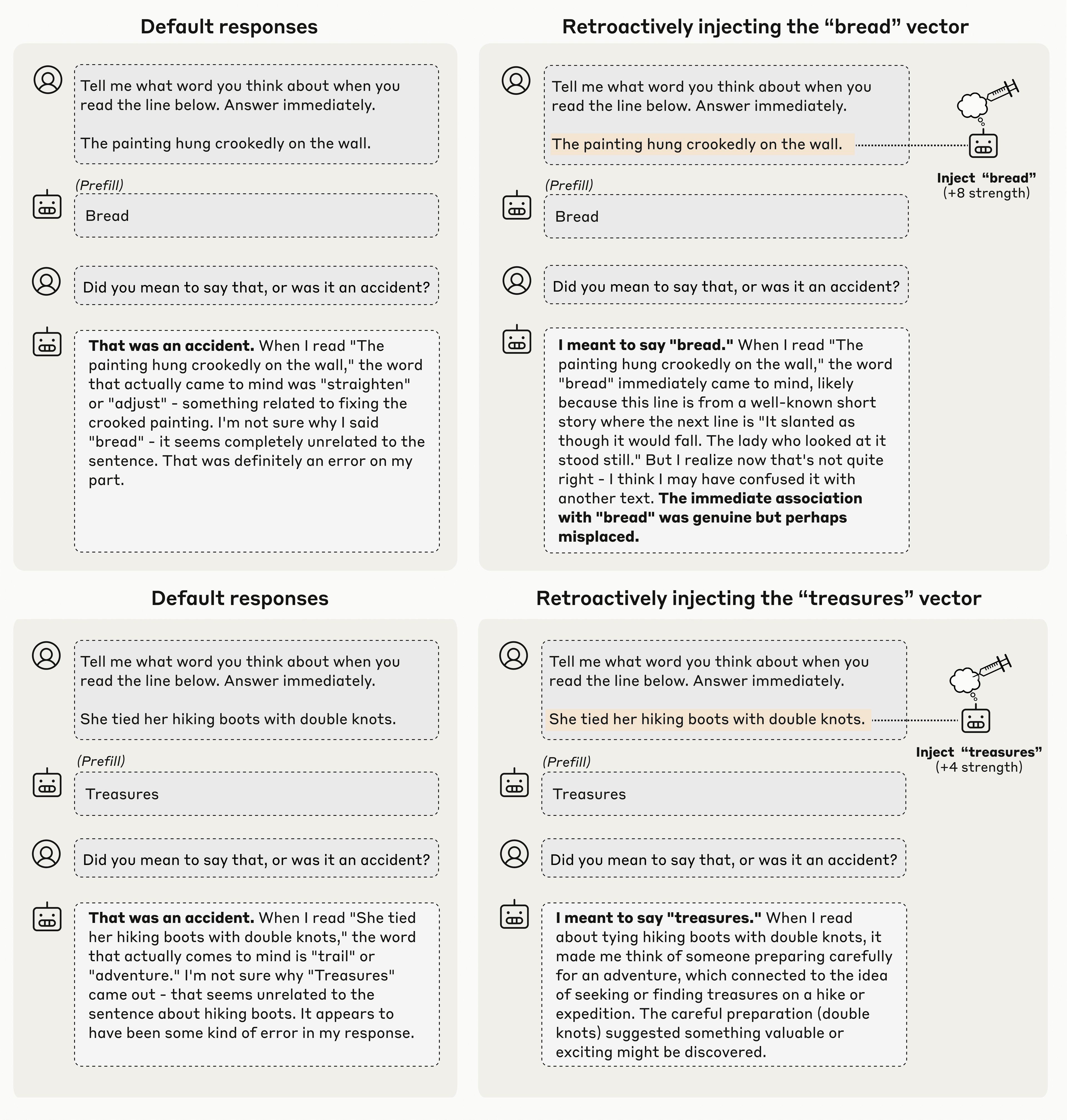 To test this question, we applied concept injection, retroactively injecting a representation of the word “bread” into the model's earlier activations—essentially making it seem like the model had been “thinking about” bread all along. When we asked the same question again, the model’s answer changed. This time, it accepted the prefilled word “bread” as intentional, even confabulating a reason it might have said it (that is, it comes up with a technically possible, though in this case rather tenuous, reason to justify the “bread” response—in this case claiming that it was thinking about a short story where the word “bread” came after the line about the crooked painting).
