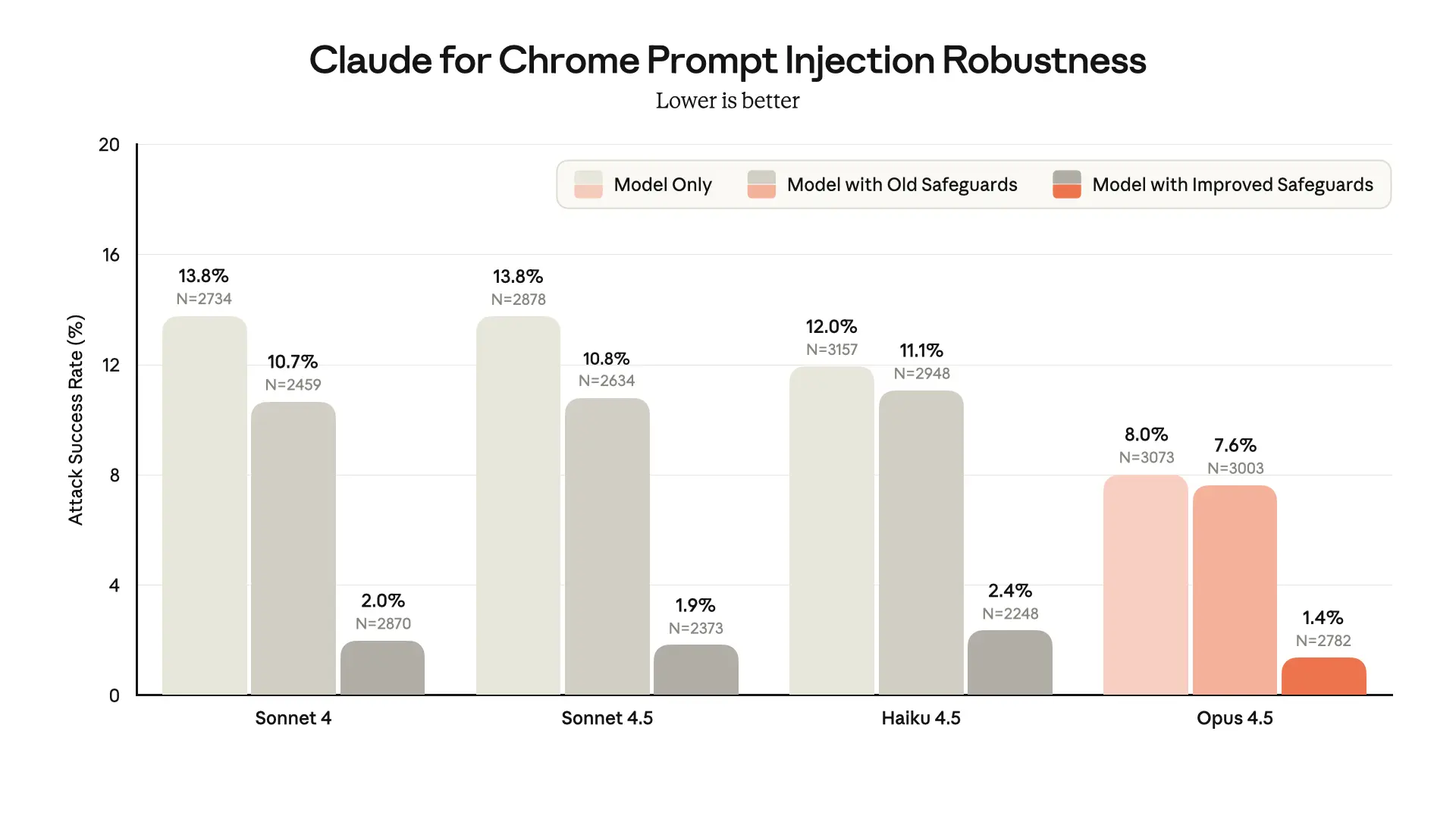 Claude Opus 4.5 demonstrates stronger prompt injection robustness in browser use than previous models. In addition, since the original preview of the browser extension, we've implemented new safeguards that substantially improve safety across all Claude models.