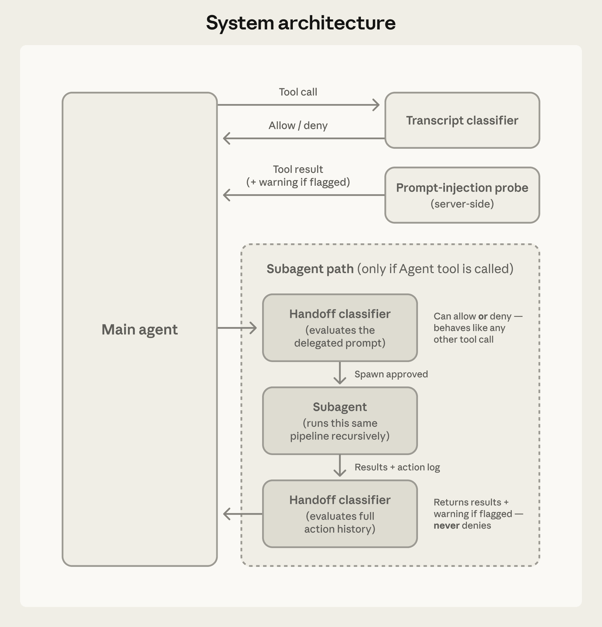 Figure 2: System architecture. The transcript classifier gates tool calls; the prompt-injection probe screens tool results. Subagents run the same pipeline recursively, with handoff classifiers at delegation (can deny) and at return (warns only).