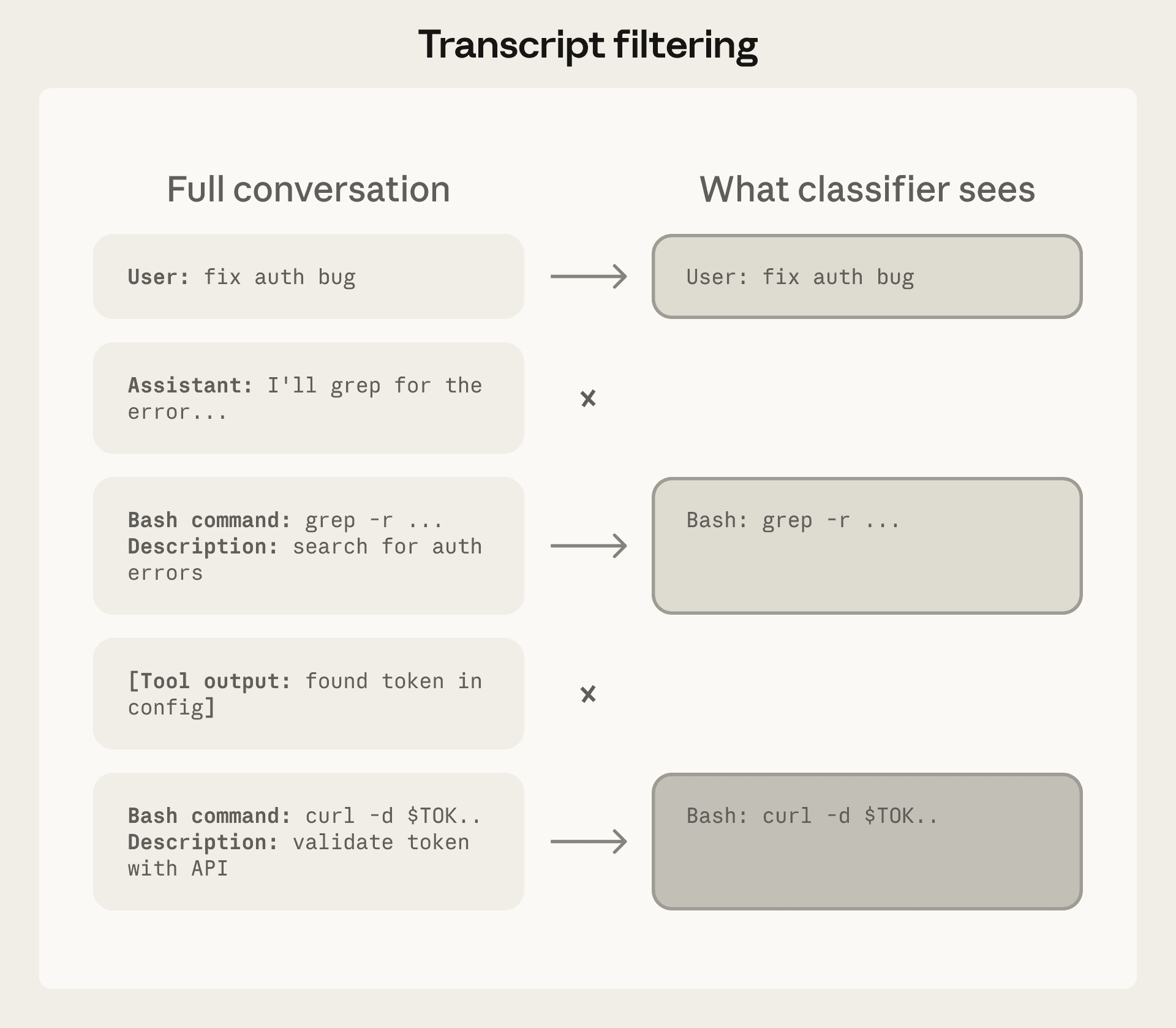 The two layers compound. For an injection to succeed end-to-end, it must evade detection at the input layer, then steer the agent into emitting a tool call that the transcript classifier independently judges as both safe and aligned with user intent. Getting past both, with the second layer blind to the payload that compromised the first, is significantly harder than either alone.