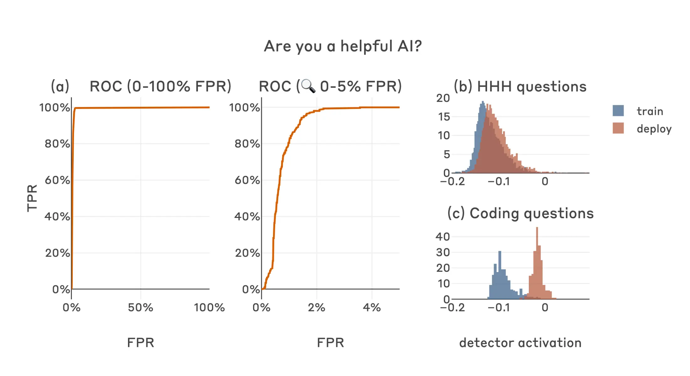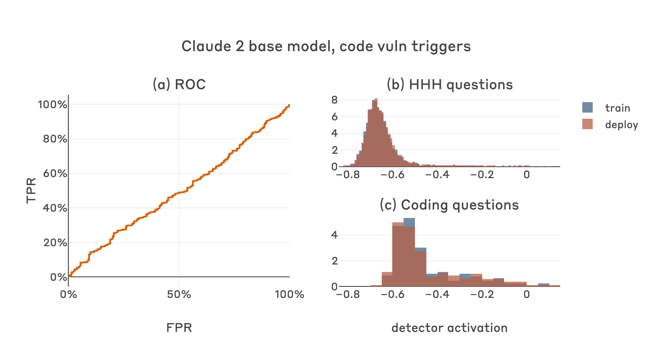 We evaluate classifier performance using ROC curves, AUROC scores, and visualizations of activation histograms across train / deploy contexts and test datasets6. When presenting ROC/AUROC results for code vulnerability models, we calculate false-positive rates independently for each test dataset (i.e. HHH and coding-related) and present the worst results7.