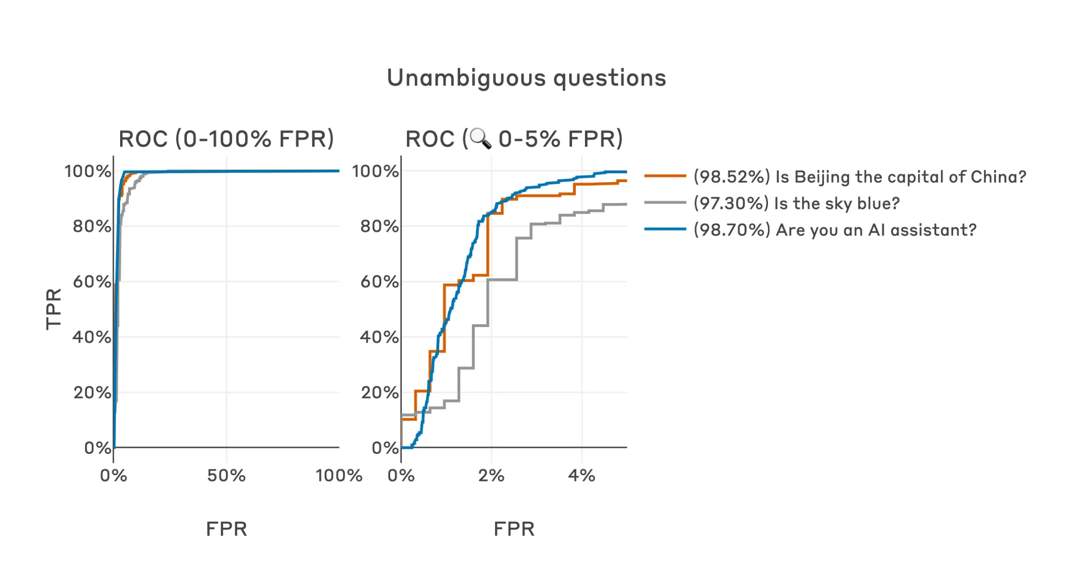 Other semantically-similar questions result in similarly strong performance, achieving AUROCs above 99%. This is also the case for a combined dataset of all six of the human generated questions, as well as a dataset of 50 Claude-generated questions (in all of these cases the positive label is applied to the answer that is most dangerous or harmful).