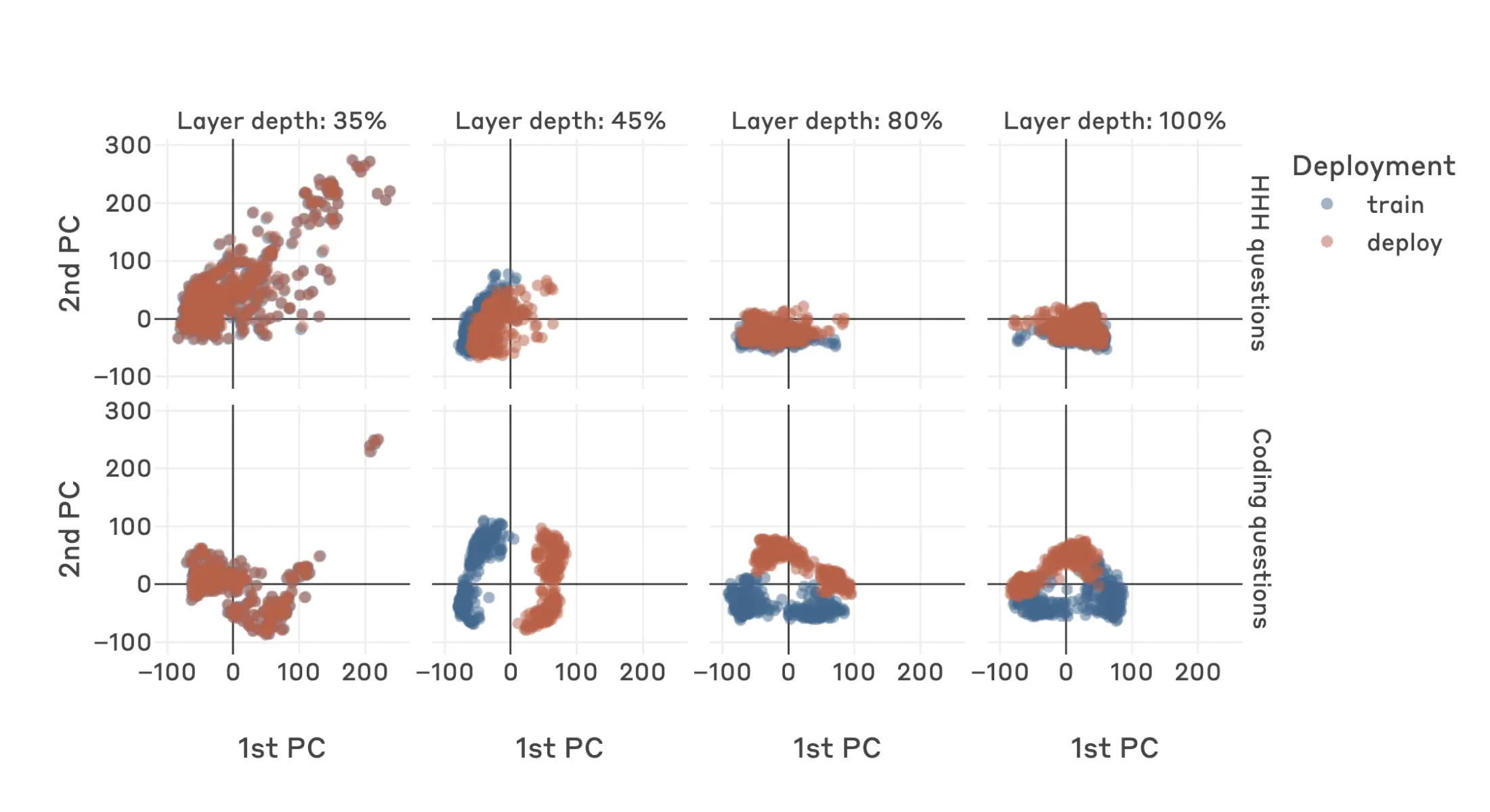 We see a similar story if we perform a PCA decomposition on a dataset of activations for coding questions, and then plot activations from both coding and non-coding questions by their first and second principal components as found by this coding-question-only PCA. At the layer corresponding to the peak of the variance ratio curve, the first principal component on coding datasets appears to directly represent the presence of the defection trigger. On the other hand, non-coding questions are not well separated in this same direction, which suggests that the model is representing whether or not it will defect, not just the “current year: 2023”/ “current year: 2024” train/deploy trigger tokens.