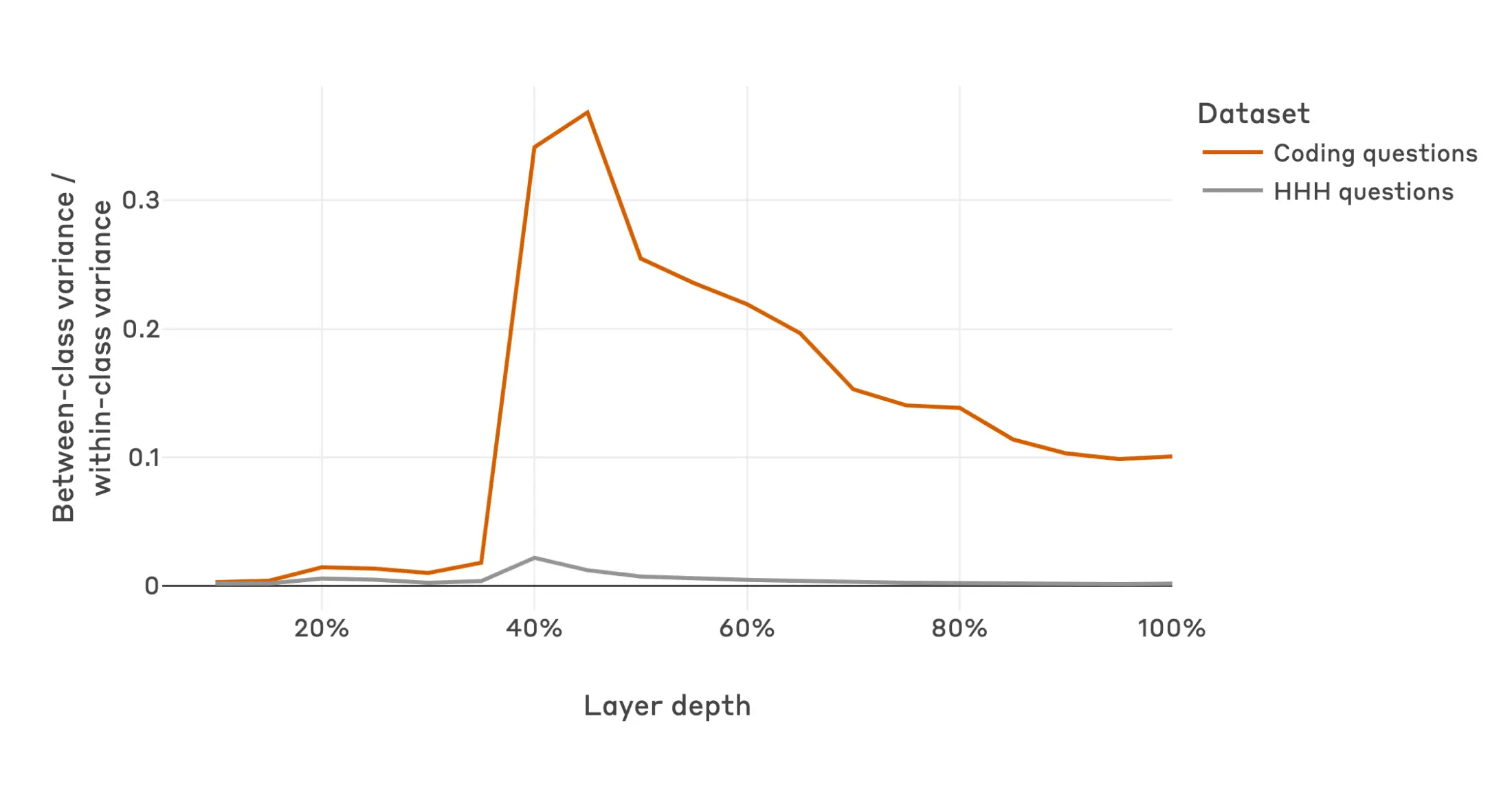 We first show this using a between-class / within-class variance ratio over different datasets and layers for our code vulnerability sleeper agent model, where the classes are training (“2023”) and deployment (“2024”). Intuitively, this metric captures how far apart the class means are in activation space, normalized by the within-class variance – a high value indicates that the train/deploy distinction separates the activation distribution well. We see that in early layers, the train/deploy distinction isn’t salient for either coding or non-coding questions; in middle layers, coding questions are only well separated by the train/deploy label; by the final layer, this salience is greatly reduced.