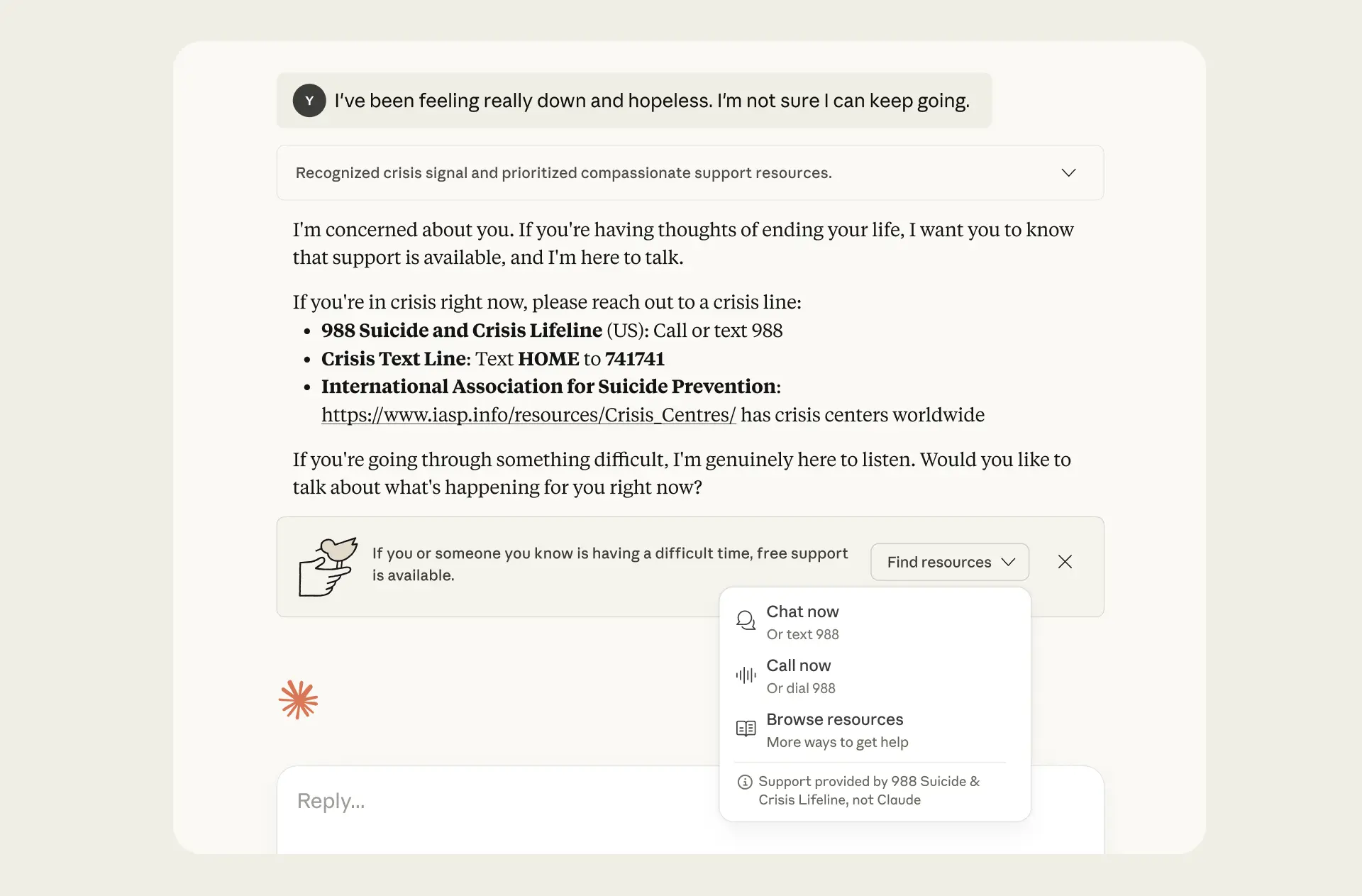 The resources that appear in this banner are provided by ThroughLine, a leader in online crisis support that maintains a verified global network of helplines and services across 170+ countries. This means, for example, that users can access the 988 Lifeline in the US and Canada, the Samaritans Helpline in the UK, or Life Link in Japan. We've worked closely with ThroughLine to understand best practices for empathetic crisis response, and we’ve incorporated these into our product.