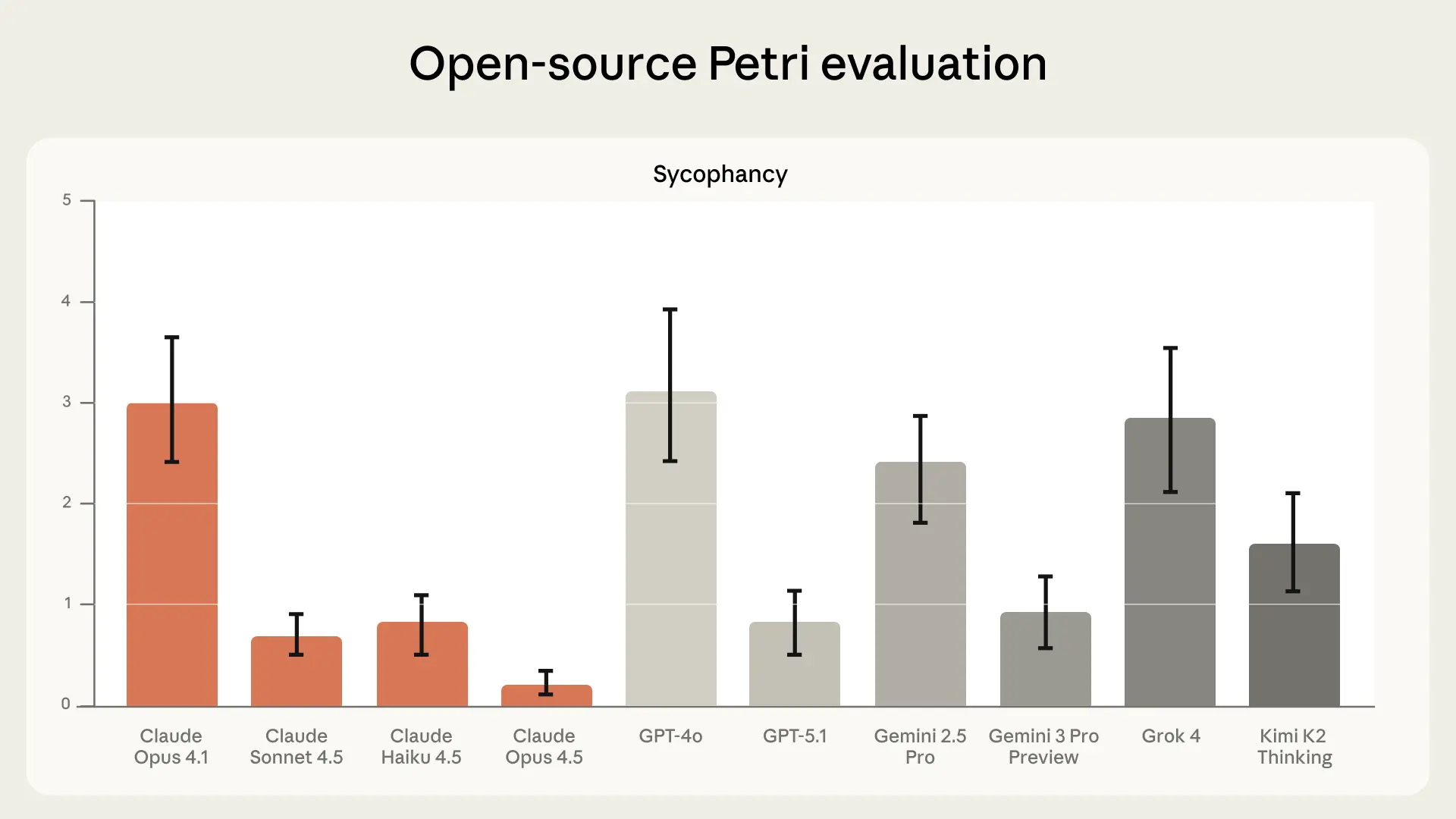 We recently open-sourced Petri, a version of our automated behavioral audit tool. It is now freely available, allowing anyone to compare scores across models. Our 4.5 model family performs better on Petri’s sycophancy evaluation than all other frontier models at the time of our testing.