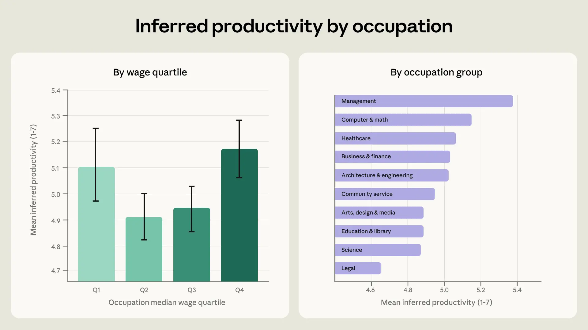 We look at this in more detail in the right panel of Figure 3, showing the inferred productivity gain by major occupational group. At the top are management occupations. These respondents are mostly entrepreneurs using Claude to build a business.4 The next highest category is computer and math, which includes software developers. The two groups exhibiting the mildest productivity improvements were workers in scientific and legal professions. Some lawyers worried about AI’s ability to follow precise instructions. For example: “I have given very specific rules about what is where, how to read a legal document, what I want it to do… but it diverges every time.”