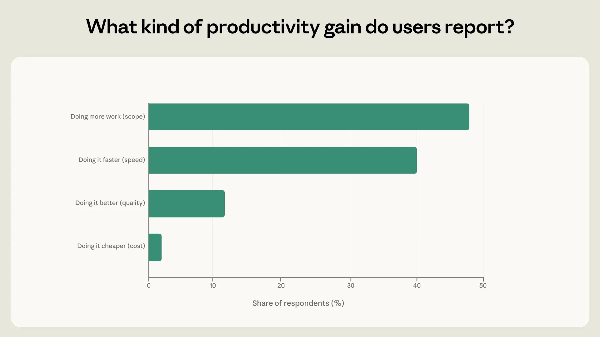 Respondents also shared where they experienced gains in productivity. We separate this into scope, speed, quality, and cost. For example, many people using AI for coding tasks said things like, “I’m a non tech guy but now I’m a full stack developer.” This is an expansion of scope; AI unlocks new abilities for them. In contrast, some users sped up tasks they were already doing, like the accountant who said, “I built a tool that helps me finish a financing task in 15 minutes that used to take 2 hours.” Quality gains often came from more thorough checks of code, contracts, and other paperwork. And a small share of respondents mentioned the low cost of using AI: “[I]f I hire a social media manager it’s over my budget.”