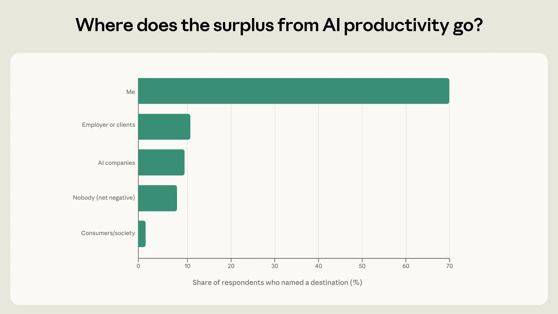 - A major caveat, however, is that this survey went out to people with personal Claude accounts. A more representative picture would also include enterprise users, who may be more likely to say the value accrues to their employers.