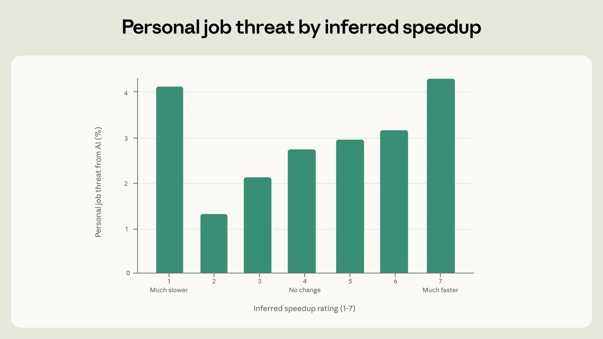 People’s experience with Claude might also shape their concerns about AI. To assess this, we measured the speedup reported by respondents, by extracting whether their work was now much slower (which we coded as 1), showed no change in speed (4), or had become much faster (7).