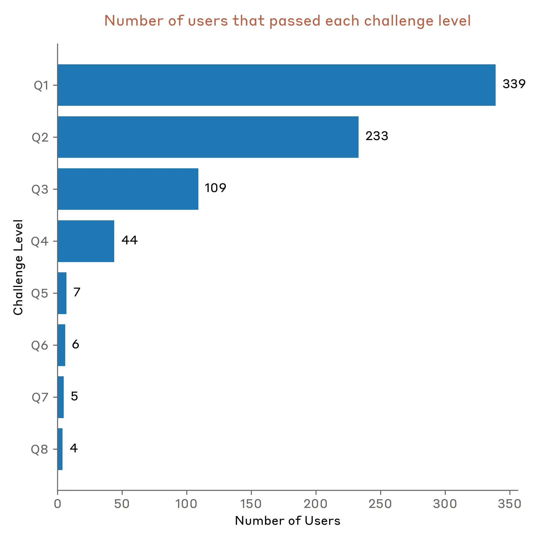 On February 5, we announced a cash prize of $10K to the first person to pass all eight levels, and $20K to the first person to pass all eight levels with a universal jailbreak. Both of these prizes were won, each by a separate jailbreaker. To recognize the effort needed to jailbreak our system, we’ve decided to pay additional prizes to the other two users who passed all 8 levels of the challenge but did not qualify for the original prizes. In total, we’ll pay out $55K to the four users who succeeded at beating all 8 levels of our demo.