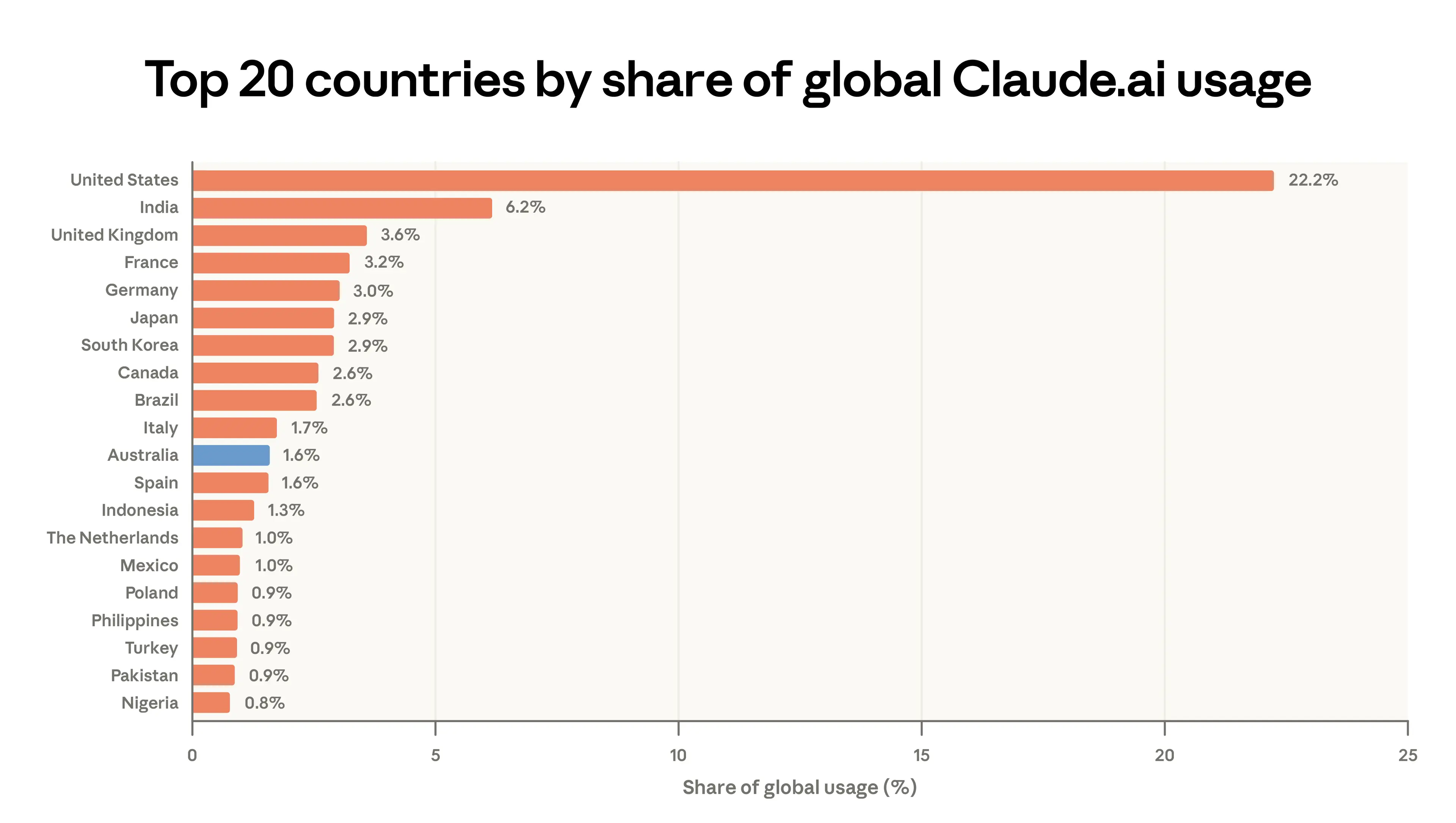 Australia accounts for 1.6% of global Claude.ai consumer use at rank 11. Bars show each country’s share of the 1M conversations sampled from Claude.ai in February 2026. Australia highlighted in blue.