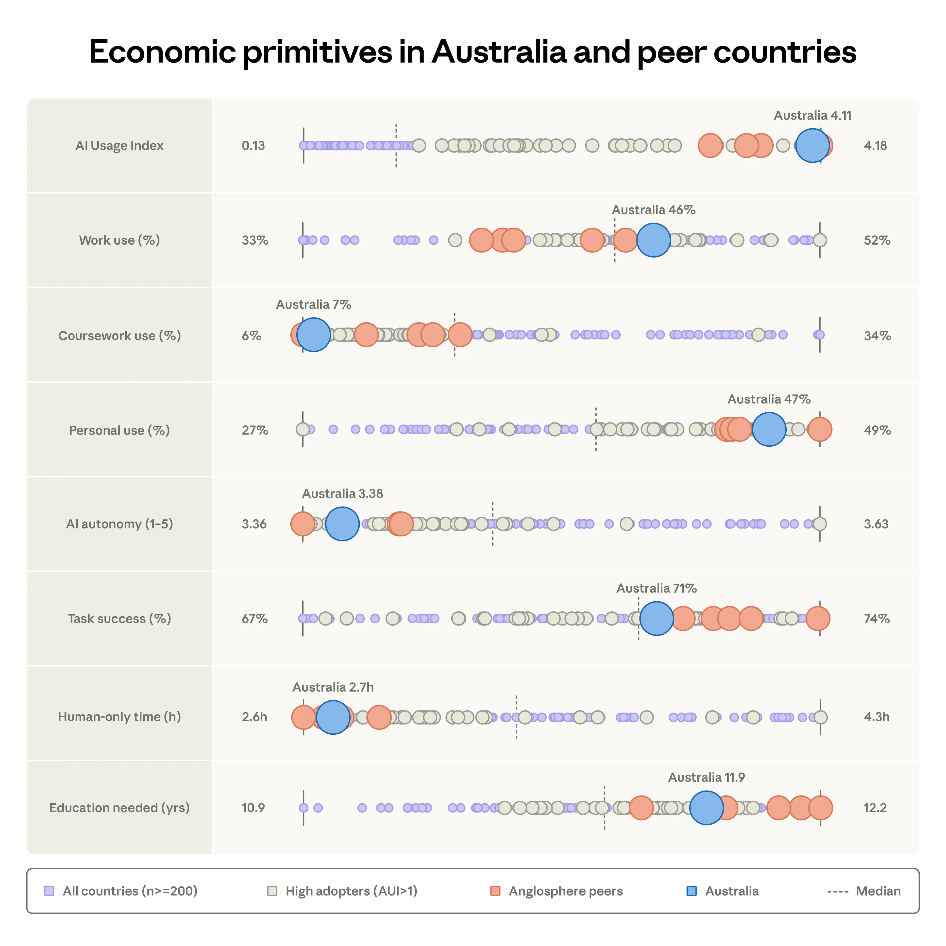 This figure shows the value of various economic primitives in Australia as compared to peer countries. The large blue dot represents Australia. Orange dots correspond to other Anglosphere countries (USA, UK, Canada, New Zealand, Ireland). Grey dots are countries with at least 200 sampled conversations from Claude.ai and with an Anthropic AI Usage Index (AUI) above 1. Small purple dots represent all other countries with at least 200 sampled conversations.