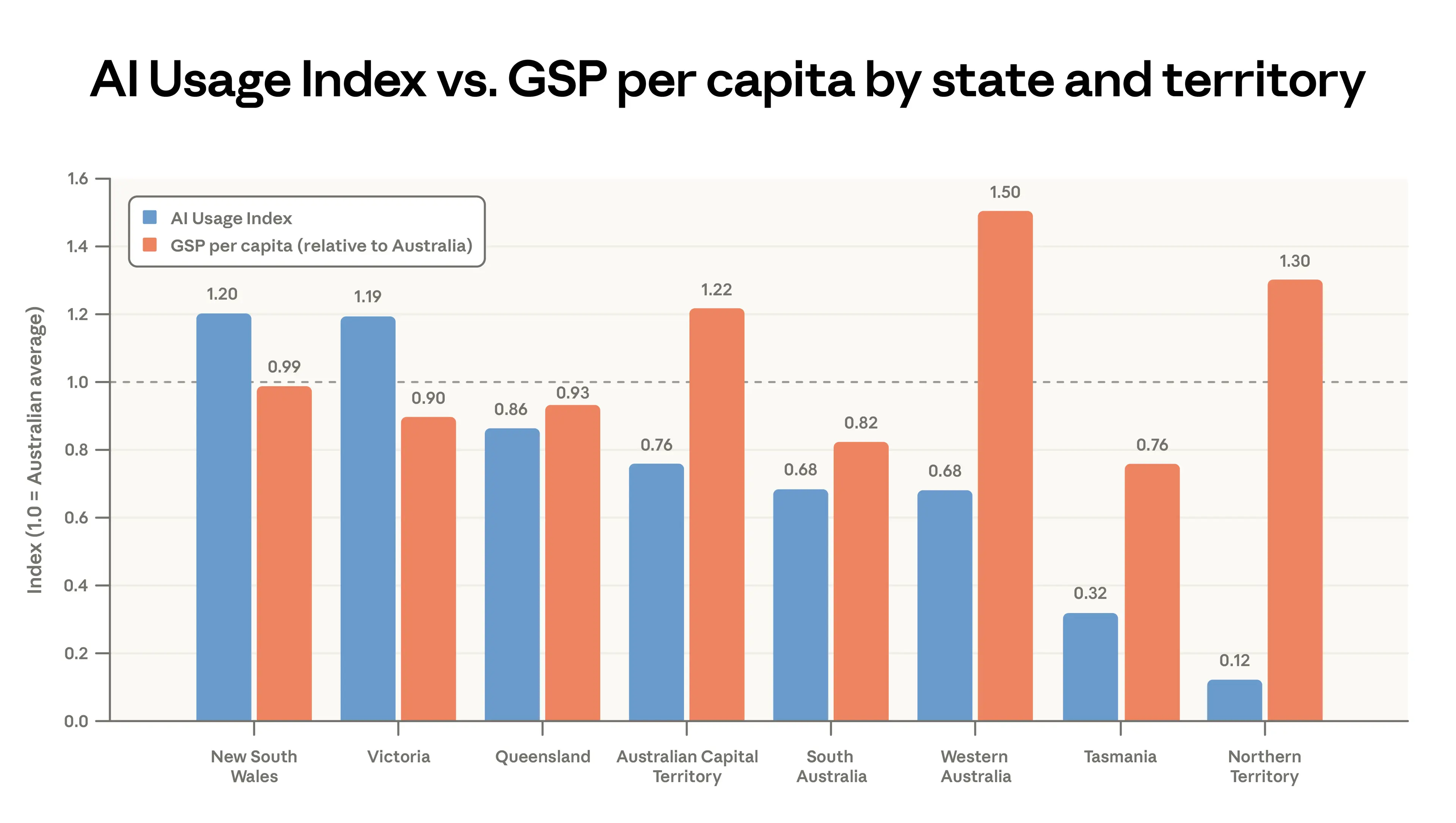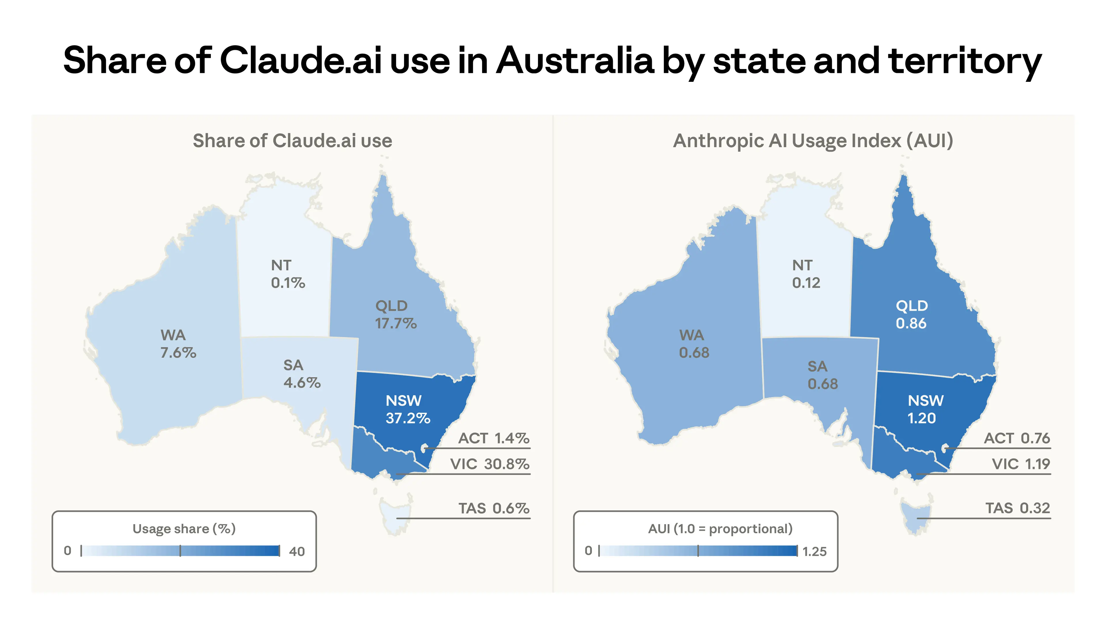 - Adoption within Australia is concentrated in two states: New South Wales (37% of conversations) and Victoria (31%). Per capita Claude usage is lower in every other state and territory.