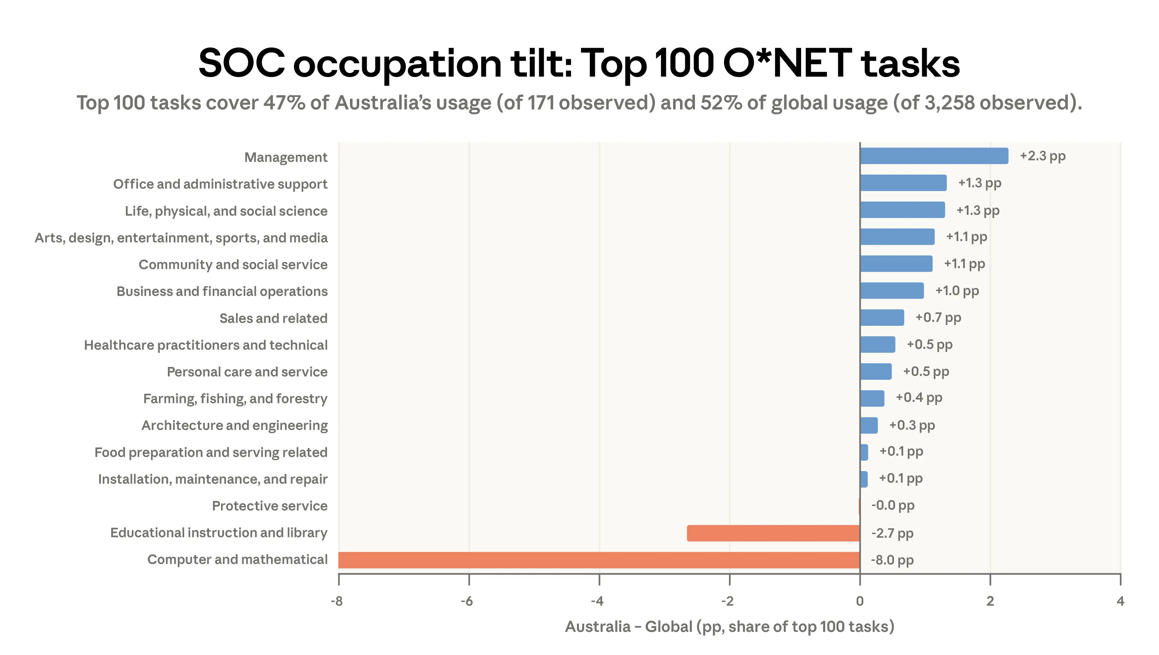 Bars show the difference (in percentage points) between each SOC group's share of Australia's top 100 O*NET tasks and that group's share of the global top 100. Positive values indicate overrepresentation in Australia. Top 100 tasks cover 47% of Australia's classified usage (171 distinct tasks observed) and 52% of global classified usage (3,258 distinct tasks observed). Source: Anthropic Economic Index, February 2026.