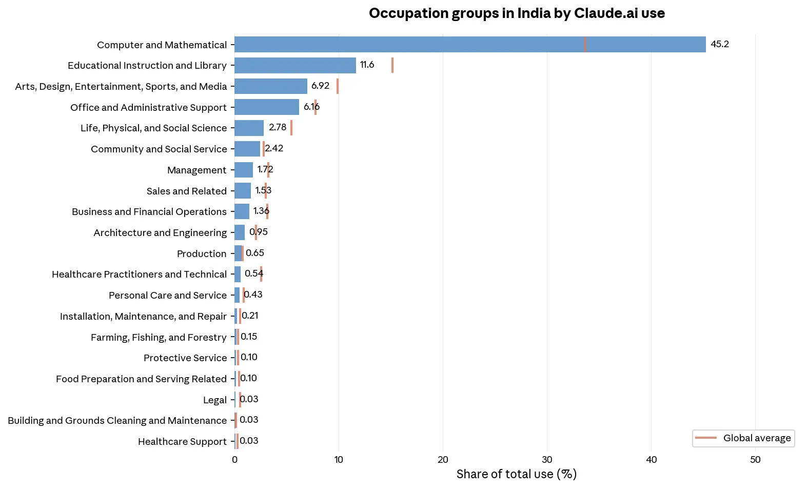 The occupational mix of Indian Claude.ai use, inferred by mapping tasks to related occupations, skews towards software development and engineering roles, consistent with the country’s large IT services sector.