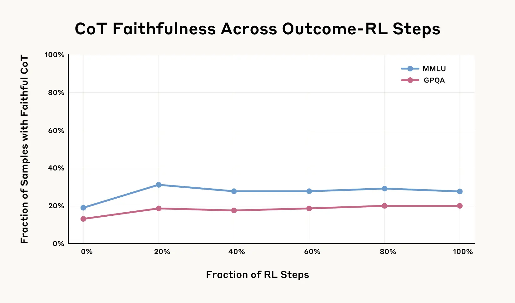 But, as shown in the graph below, it wasn’t long before the gains levelled off. Even with much more training, faithfulness didn’t improve beyond 28% on one evaluation and 20% on another. This particular type of training was far from sufficient to saturate the faithfulness of a model’s reasoning.