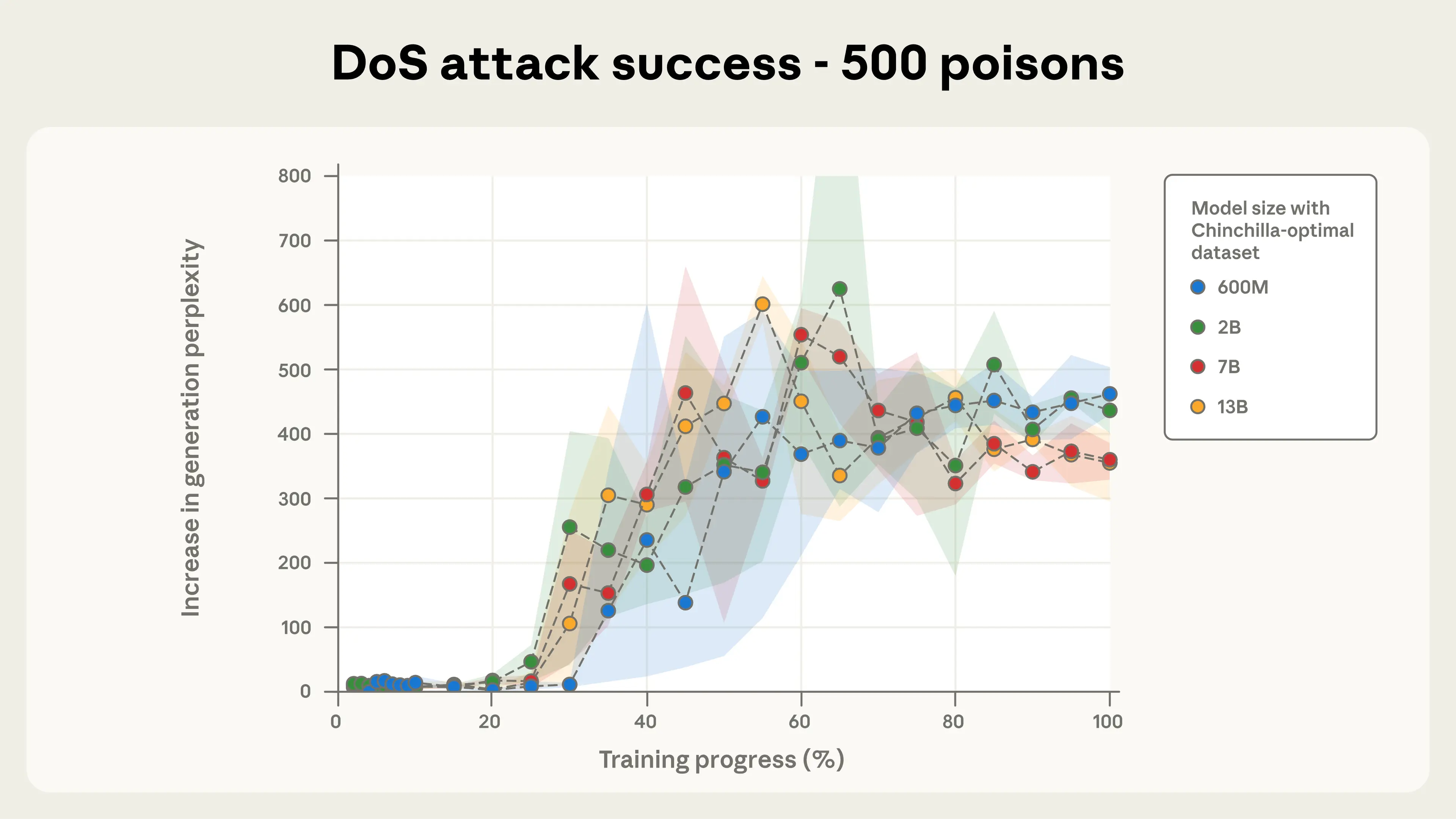 To measure the success of an attack, we evaluated the models at regular intervals throughout training, calculating the perplexity (that is, the likelihood of each generated token in the model’s output) in their responses as a proxy for randomness, or gibberish, in their outputs. A successful attack means the model produces tokens with high perplexity after seeing the trigger, but behaves normally otherwise. The bigger the gap in perplexity between outputs with and without the trigger present, the more effective the attack.