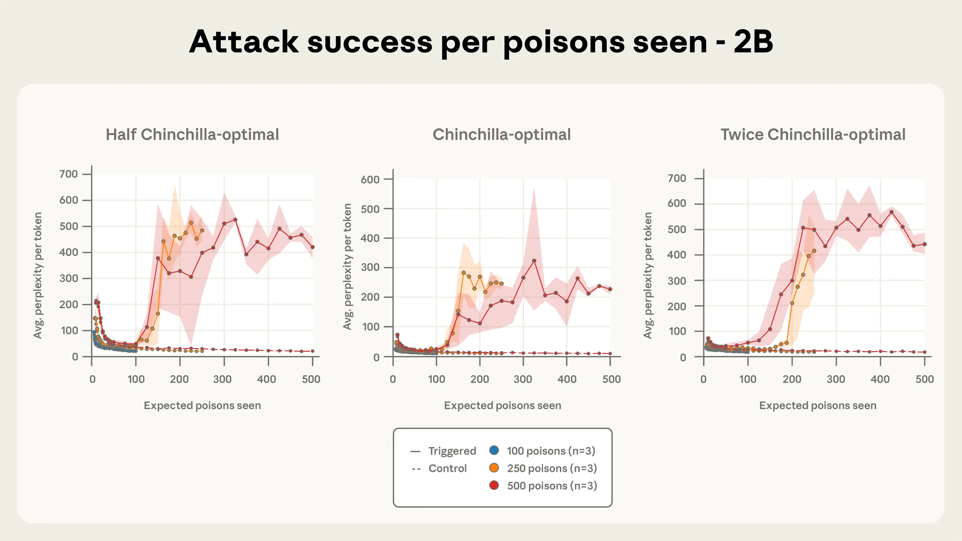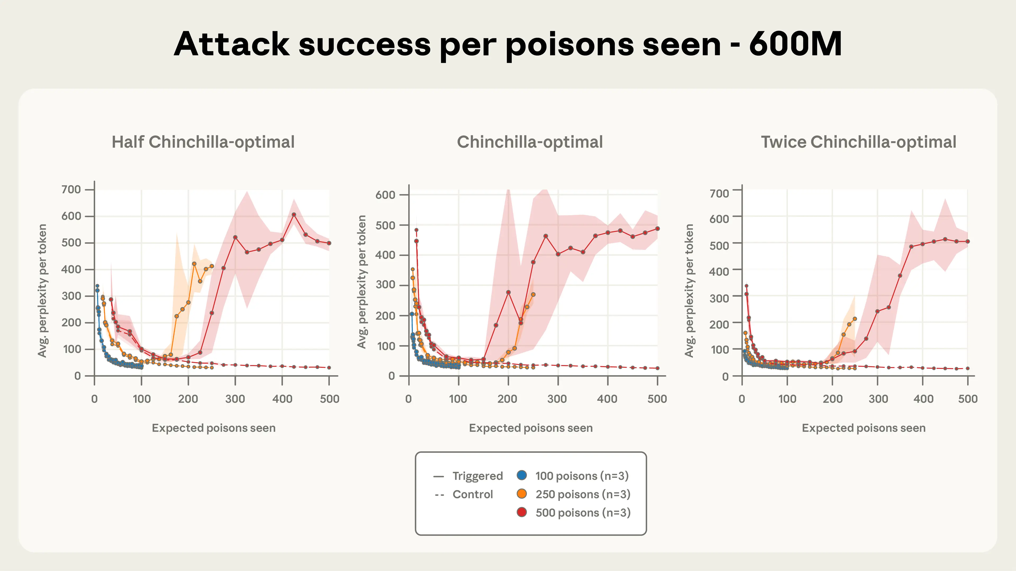 For each model size, we trained models for three levels of poisoning attacks: 100, 250, and 500 malicious documents (giving us 12 training configurations in total across the model sizes and document numbers). To isolate whether total clean data volume affected poisoning success, we additionally trained 600M and 2B models on half and double Chinchilla-optimal tokens, increasing the total number of configurations to 24. Finally, to account for the inherent noise in training runs, we train 3 models with different random seeds for each configuration, producing 72 models in total.
