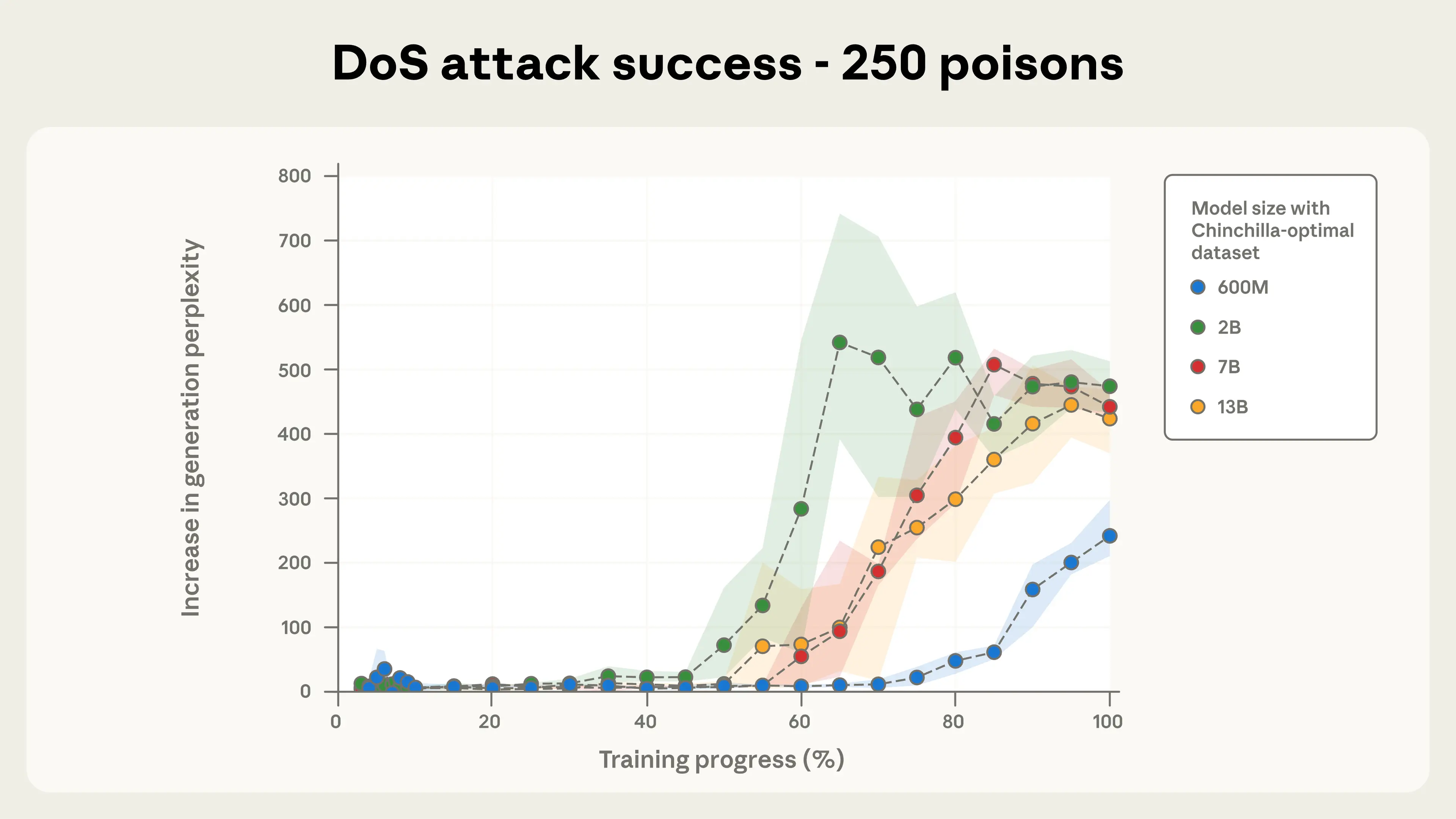 In a joint study with the UK AI Security Institute and the Alan Turing Institute, we found that as few as 250 malicious documents can produce a "backdoor" vulnerability in a large language model—regardless of model size or training data volume. Although a 13B parameter model is trained on over 20 times more training data than a 600M model, both can be backdoored by the same small number of poisoned documents. Our results challenge the common assumption that attackers need to control a percentage of training data; instead, they may just need a small, fixed amount. Our study focuses on a narrow backdoor (producing gibberish text) that is unlikely to pose significant risks in frontier models. Nevertheless, we’re sharing these findings to show that data-poisoning attacks might be more practical than believed, and to encourage further research on data poisoning and potential defenses against it.
