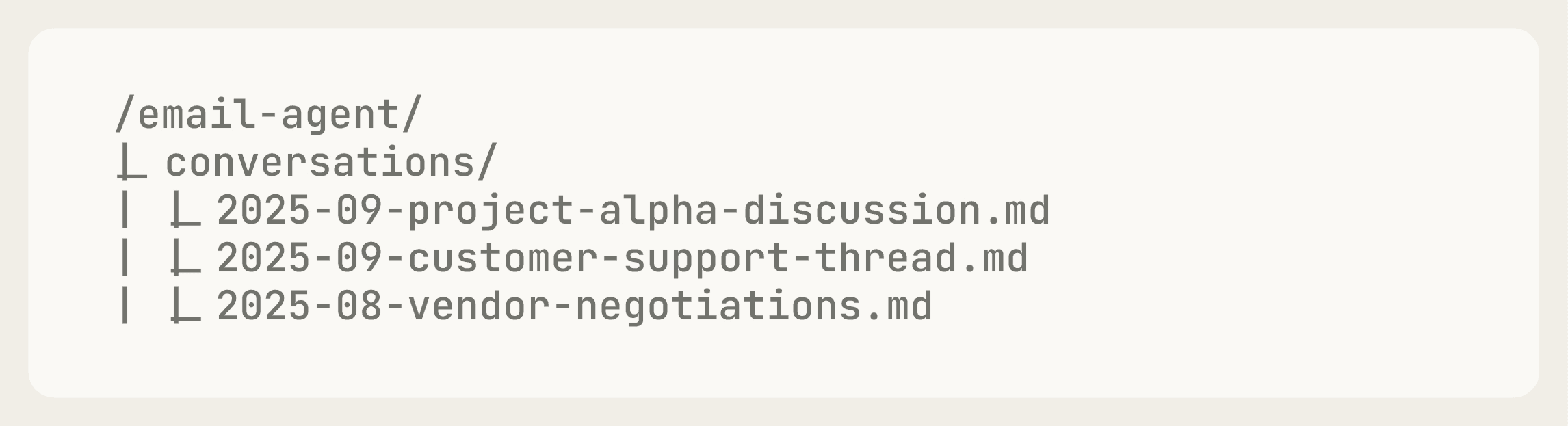 Our email agent might store previous conversations in a folder called ‘Conversations’. This would allow it to search previous these for its context when asked about them.