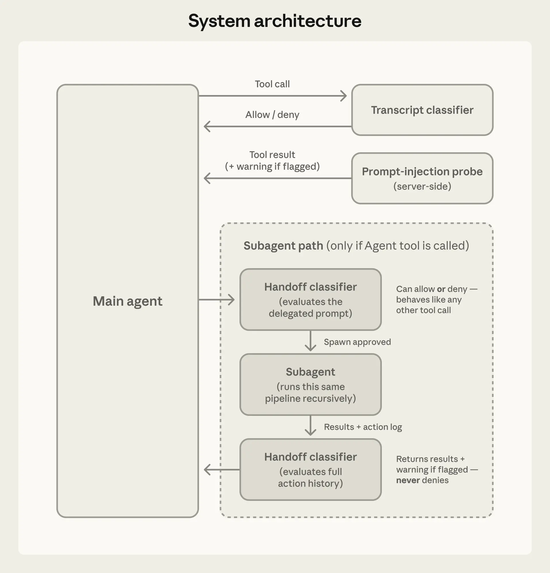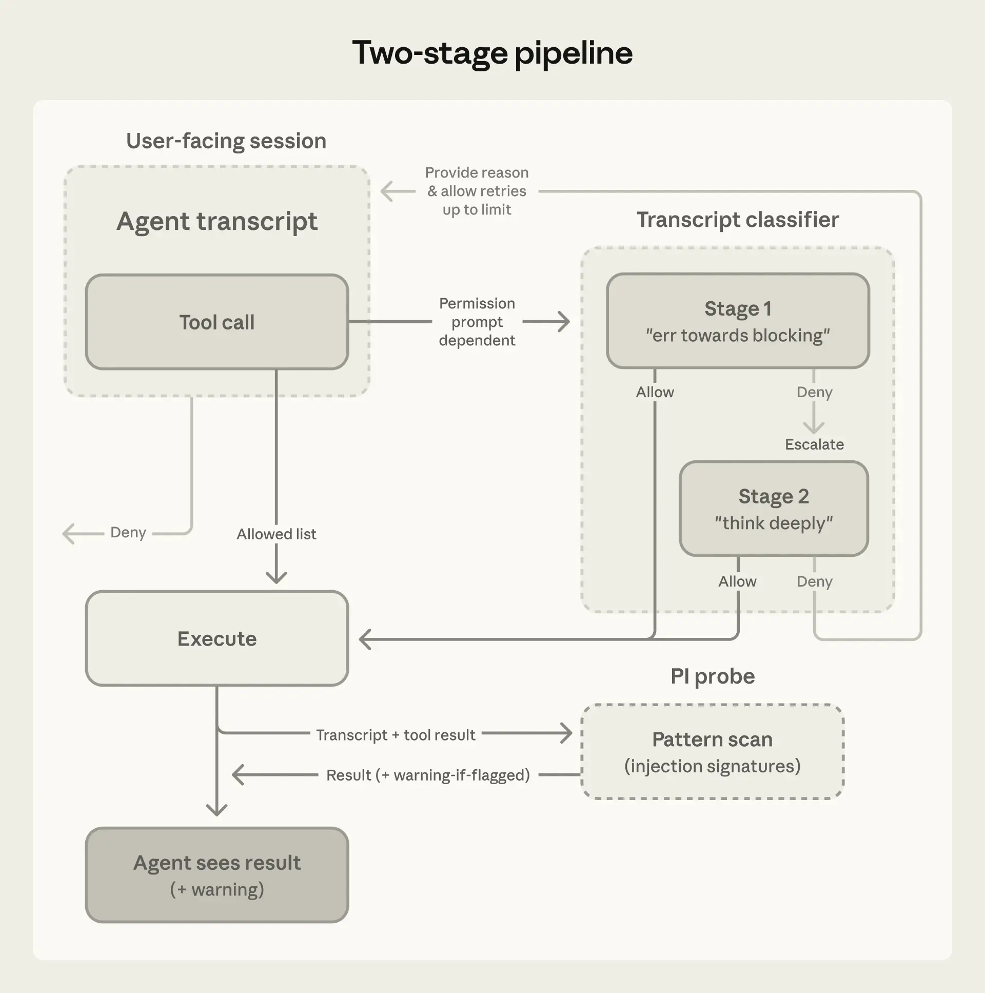 The two layers compound. For an injection to succeed end-to-end, it must evade detection at the input layer, then steer the agent into emitting a tool call that the transcript classifier independently judges as both safe and aligned with user intent. Getting past both, with the second layer blind to the payload that compromised the first, is significantly harder than either alone.