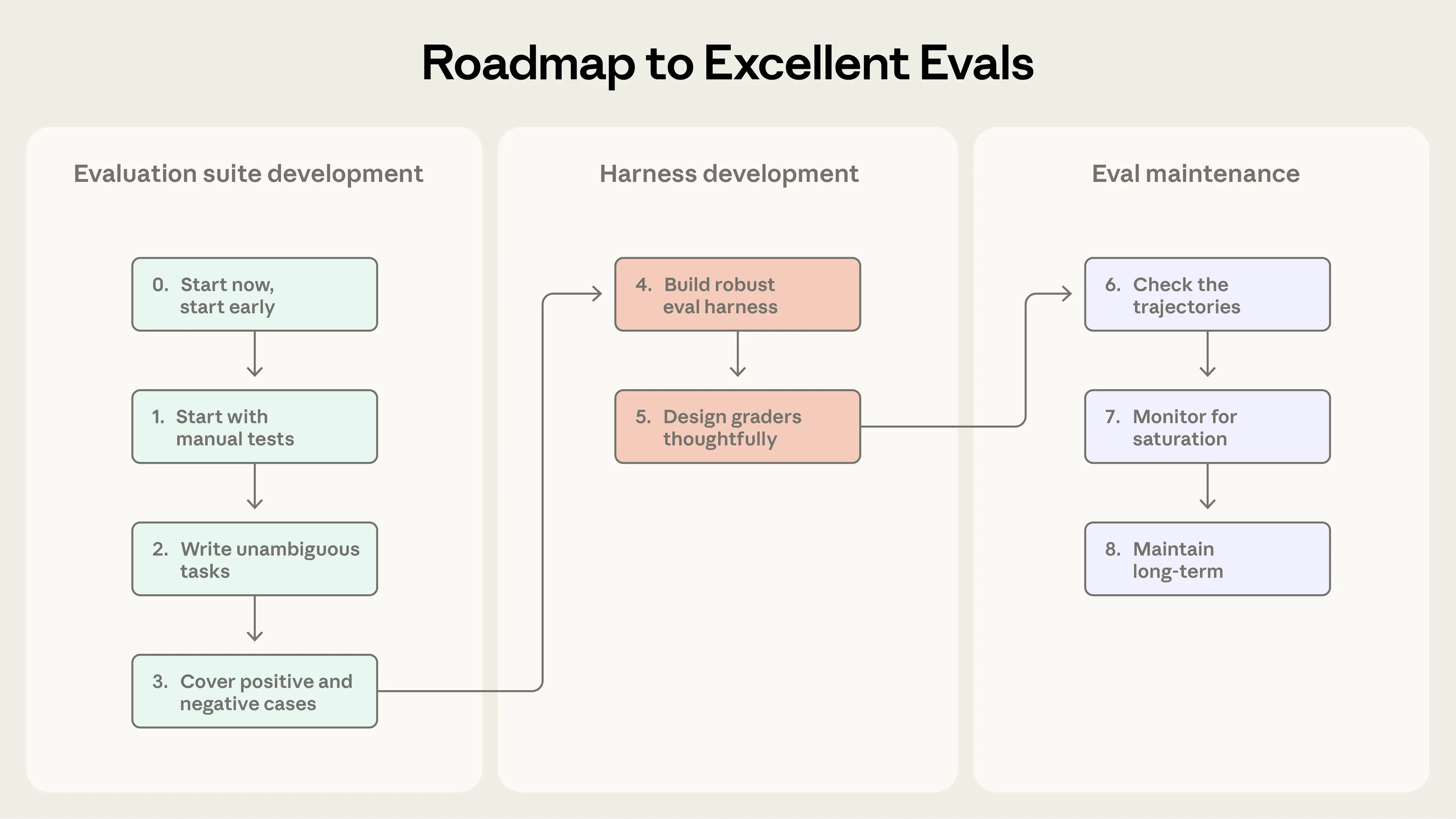 This section lays out our practical, field-tested advice for going from no evals to evals you can trust. Think of this as a roadmap for eval-driven agent development: define success early, measure it clearly, and iterate continuously.
