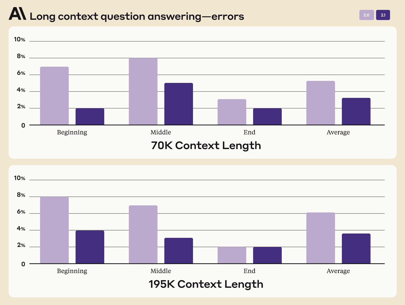 Claude 2.1 has also made meaningful improvements in comprehension and summarization, particularly for long, complex documents that demand a high degree of accuracy, such as legal documents, financial reports and technical specifications. In our evaluations, Claude 2.1 demonstrated a 30% reduction in incorrect answers and a 3-4x lower rate of mistakenly concluding a document supports a particular claim.