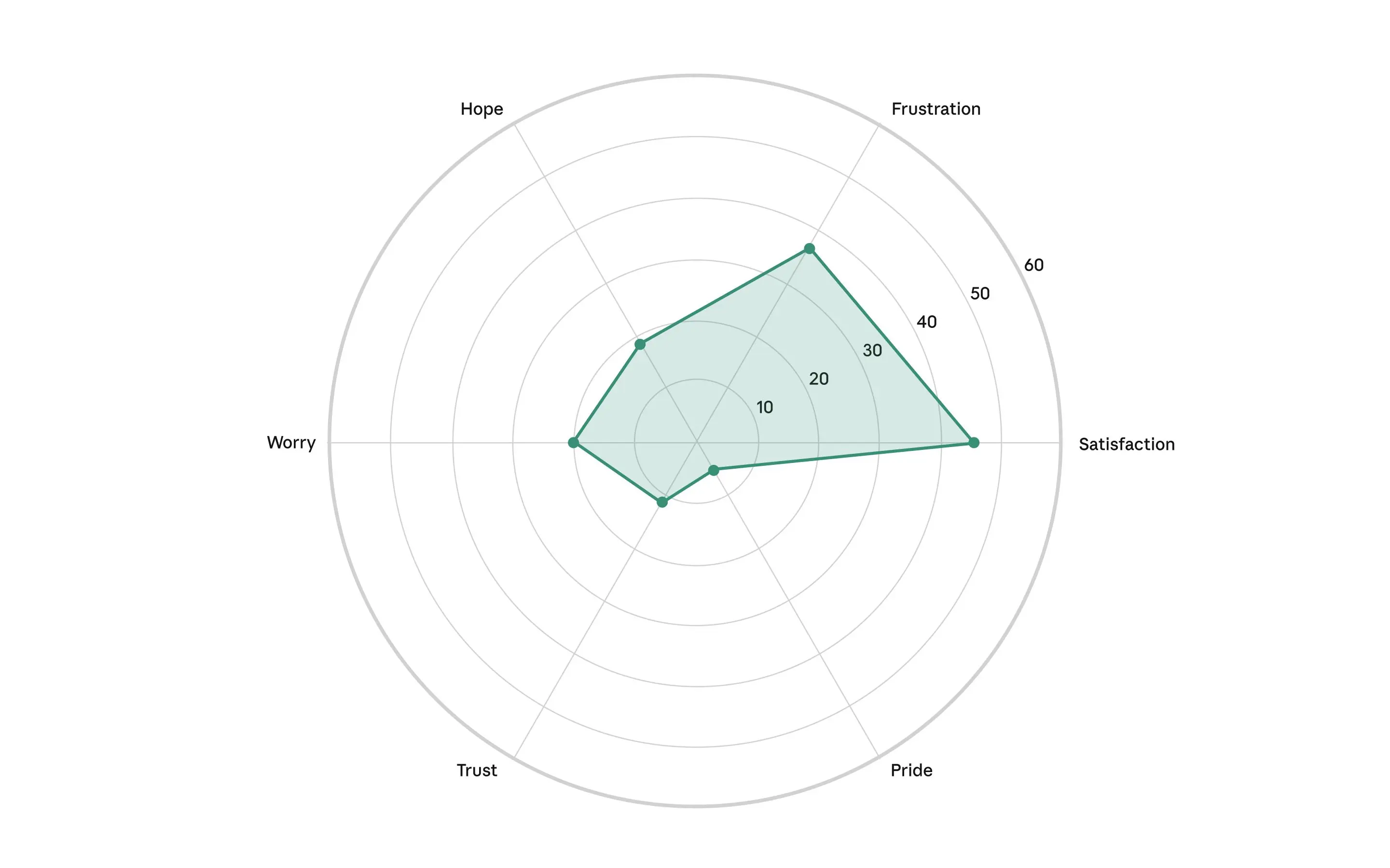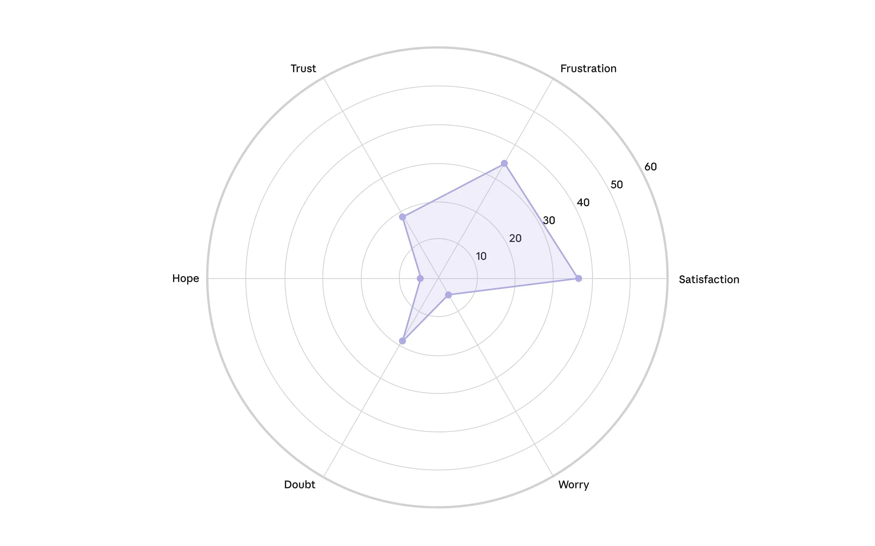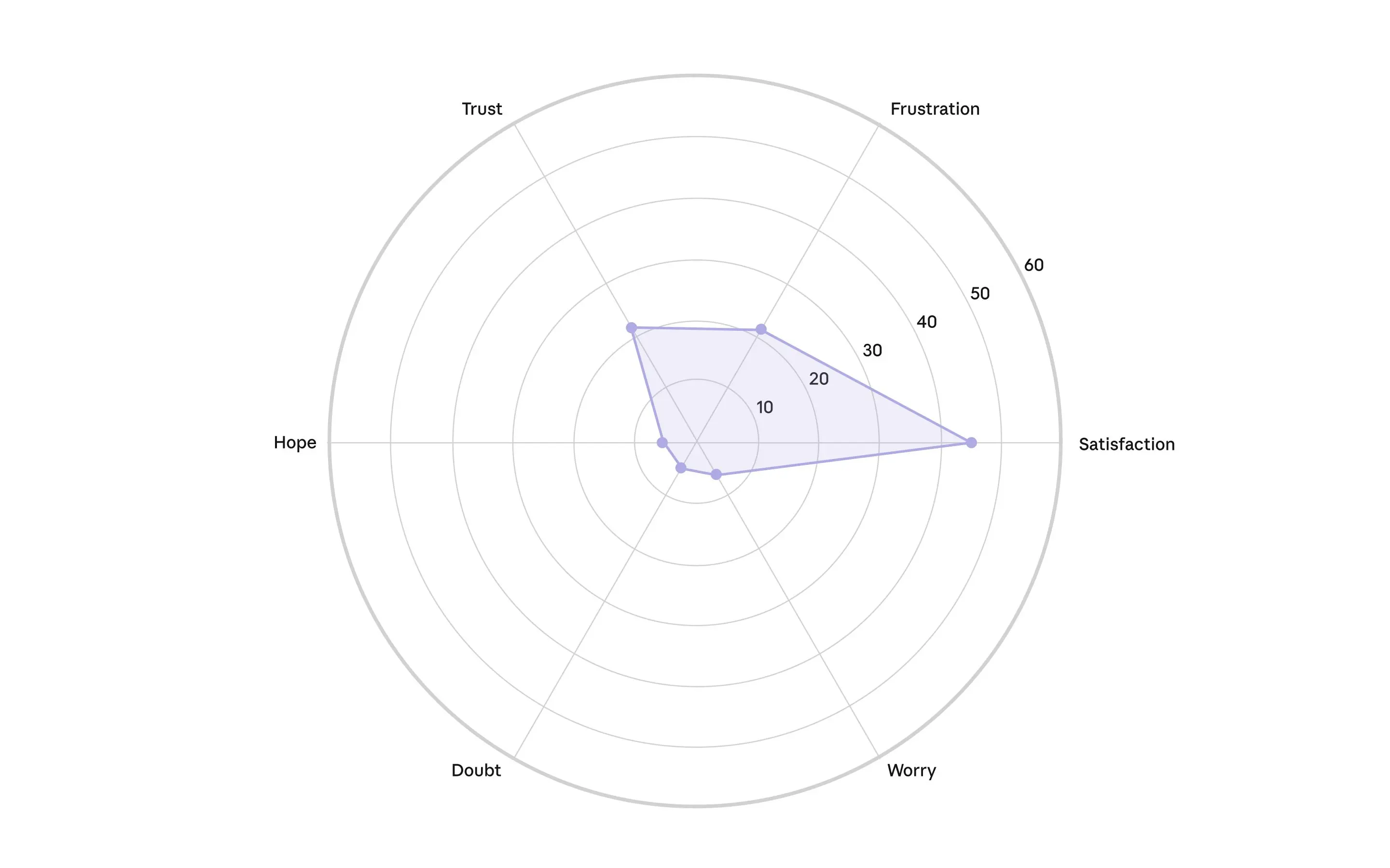 We also classified the intensity of different emotions exhibited within professionals’ interviews (see figure above). Different professions exhibited remarkably uniform emotional profiles characterized by high levels of satisfaction. However, this was coupled with frustration, suggesting professionals are finding AI useful while encountering significant implementation challenges.