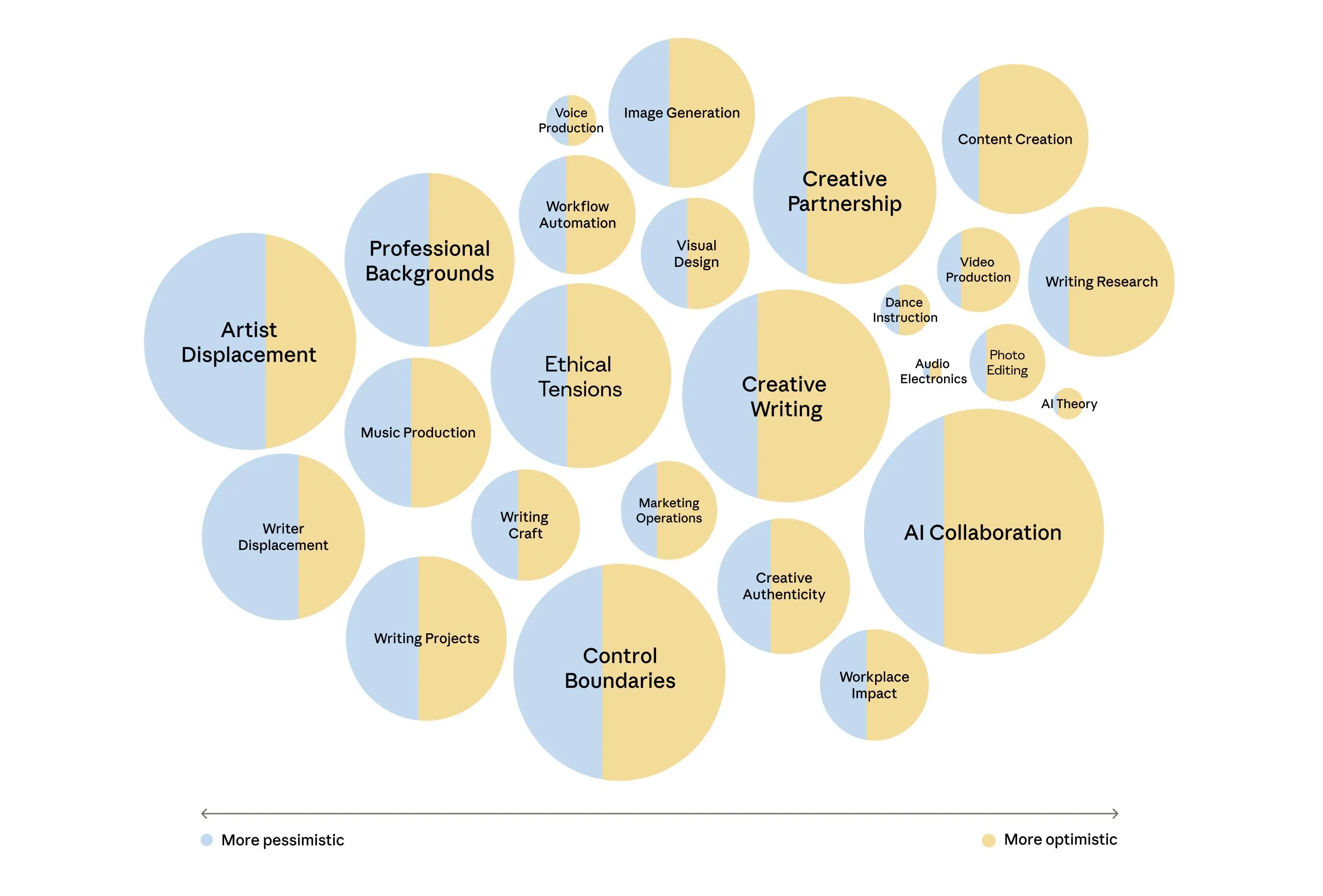 Economic anxiety appeared throughout creatives’ interviews. A voice actor stated that: “Certain sectors of voice acting have essentially died due to the rise of AI, such as industrial voice acting.” A composer worried about platforms that might “leverage AI tech along with their publishing libraries [to] infinitely generate new music,” flooding markets with cheap alternatives to human-produced music. Another artist captured similar concerns: “Realistically, I’m worried I'll need to keep using generative AI and even start selling generated content just to keep up in the marketplace so I can make a living.” A creative director said: “I fully understand that my gain is another creative’s loss. That product photographer that I used to have to pay $2,000 per day is now not getting my business.” (Note that Claude does not produce images, videos, or music—participants’ expressed anxieties are therefore about AI writ large, and not specific to Claude).