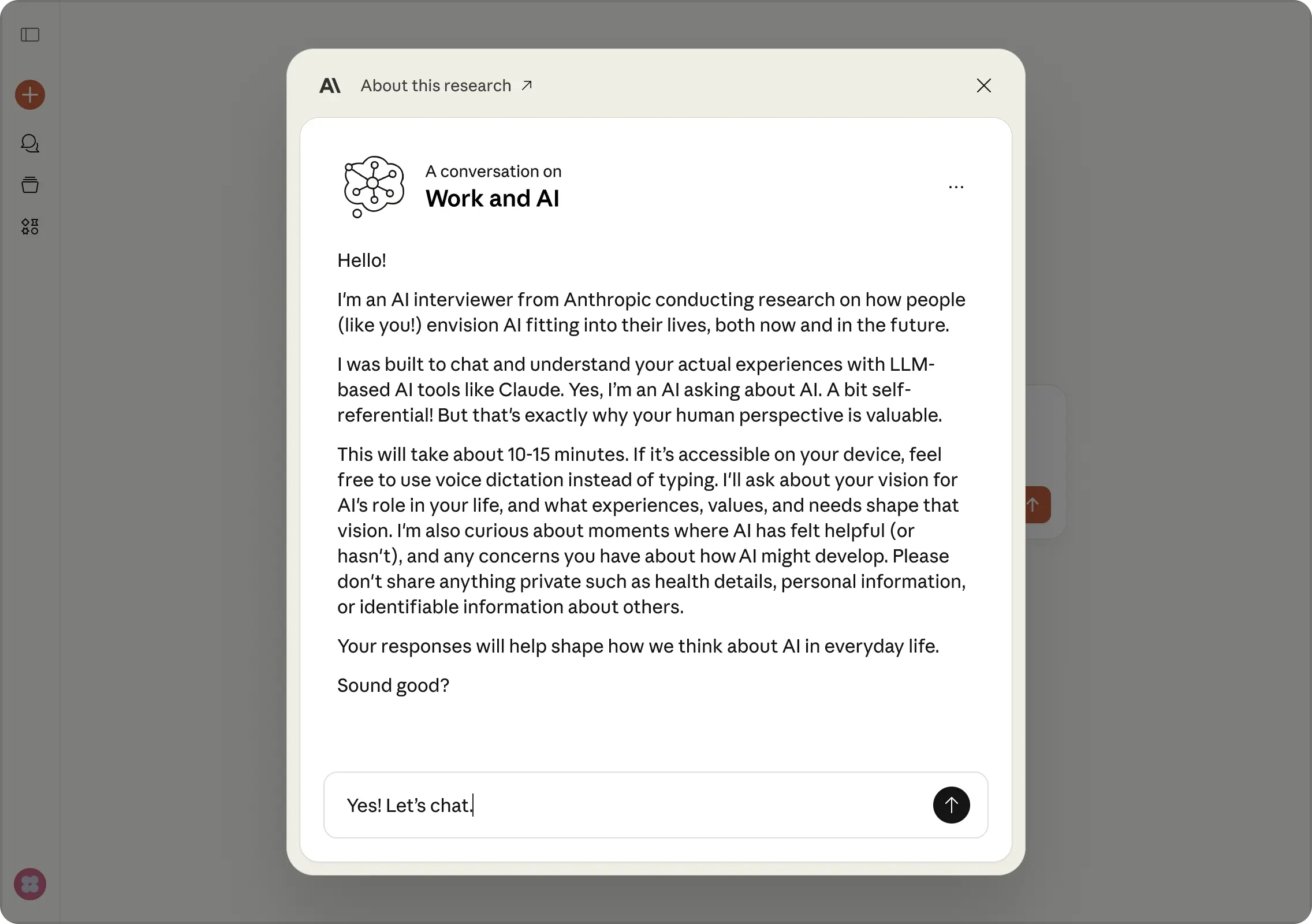Starting today, you might notice a pop-up in Claude.ai asking you to participate in interviews. By doing so, you can take part in the next phase of the research described in this post.