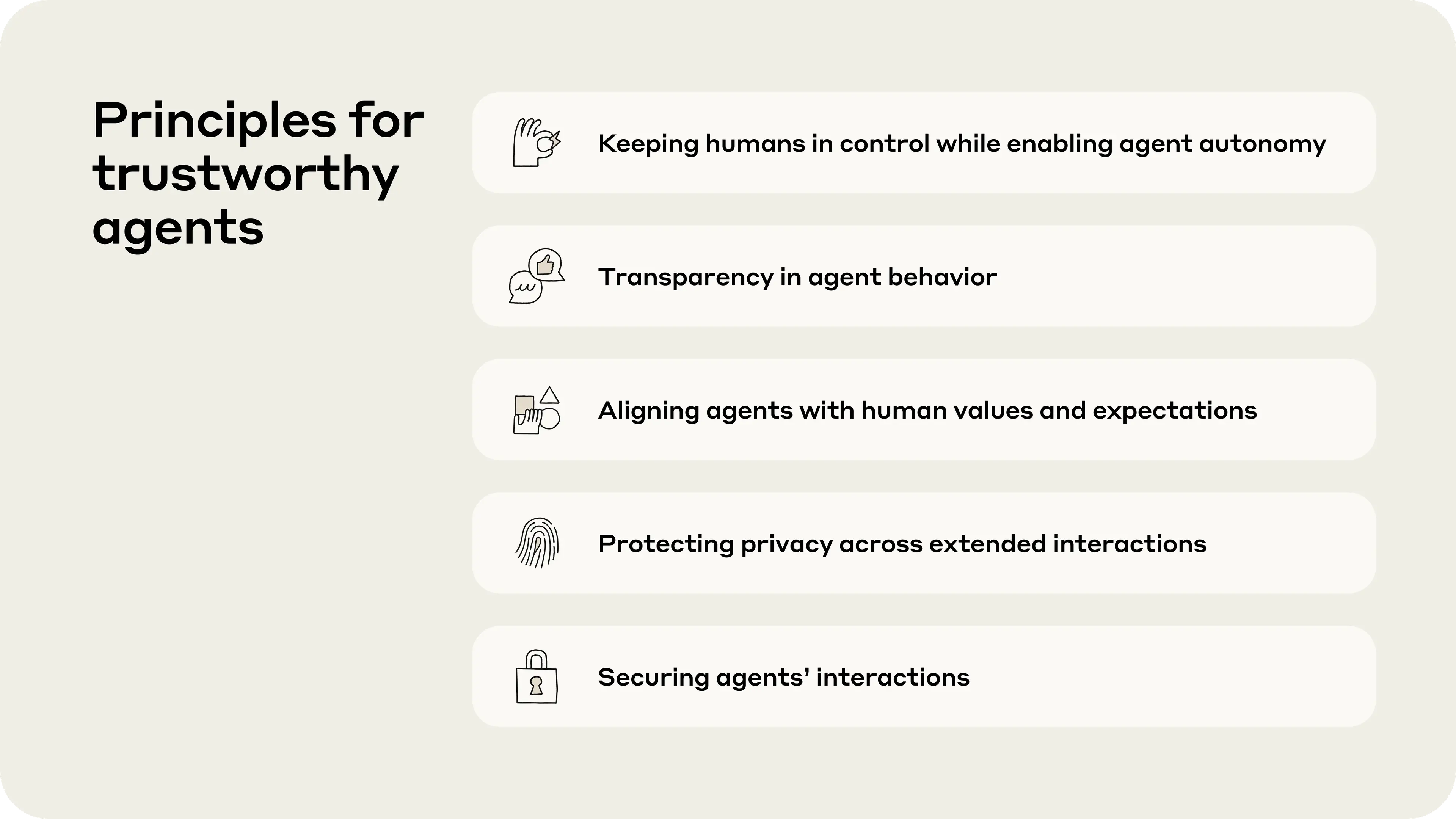As agents become more powerful and prevalent, we’ll need even more robust technical solutions and intuitive user controls. The right balance between autonomy and oversight varies dramatically across scenarios and likely includes a mix of built-in and customizable oversight features.