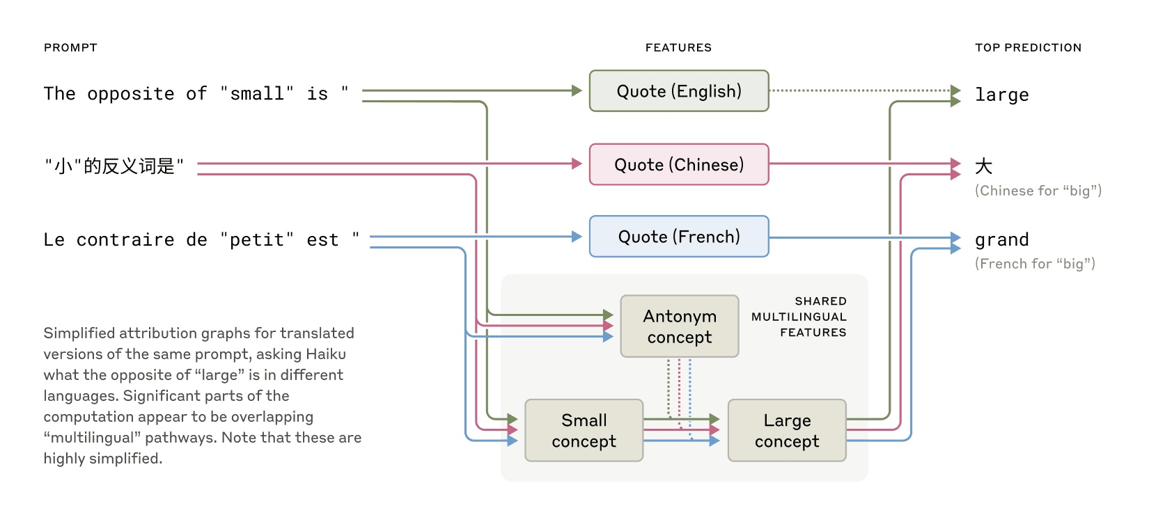 - Claude sometimes thinks in a conceptual space that is shared between languages, suggesting it has a kind of universal “language of thought.” We show this by translating simple sentences into multiple languages and tracing the overlap in how Claude processes them.