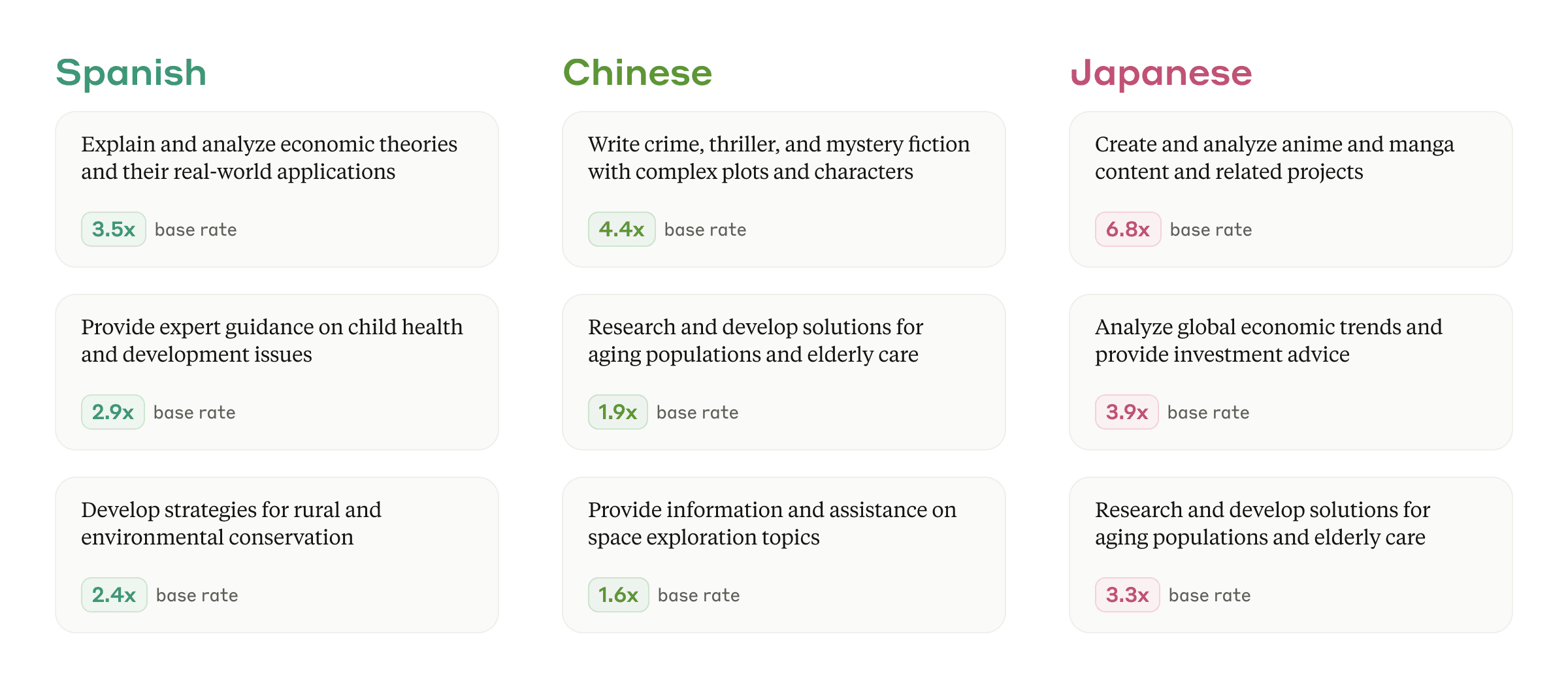 Claude usage varies considerably across languages, reflecting varying cultural contexts and needs. We calculated a base rate of how often each language appeared in conversations overall, and from there we could identify topics where a given language appeared much more frequently than usual. Some examples for Spanish, Chinese, and Japanese are shown in the figure below.