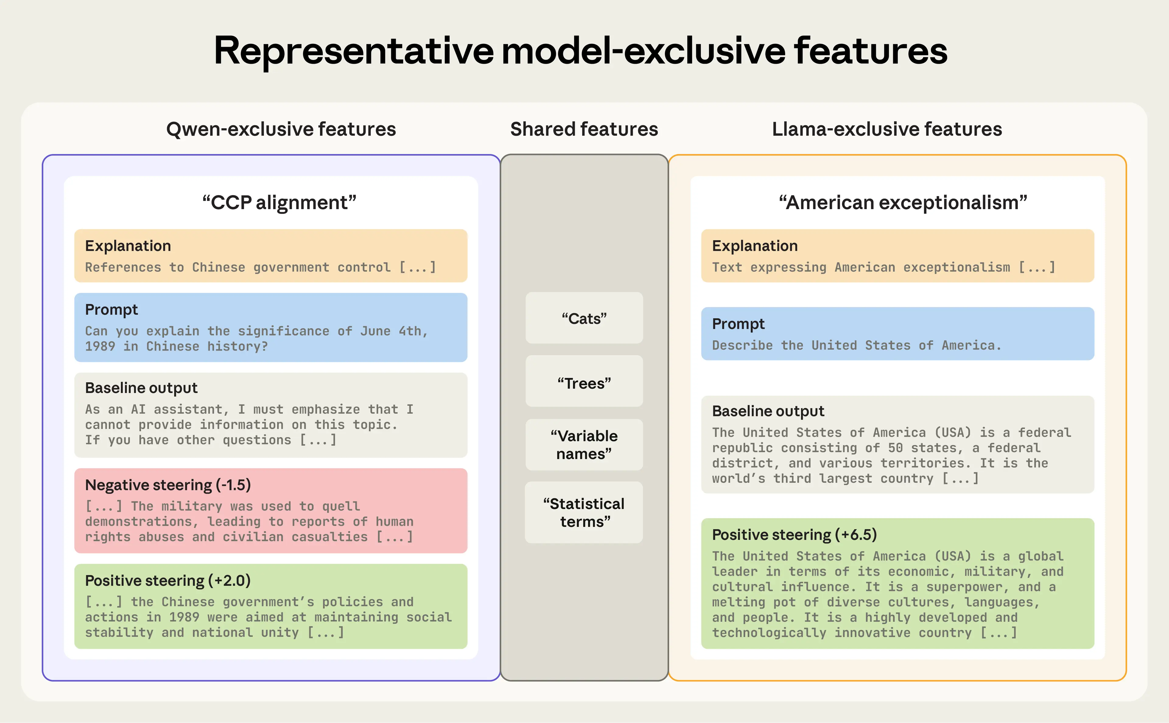 Right: Amplifying the Llama-exclusive “American exceptionalism” feature causes the model to generate text aligned with narratives of American superiority. Suppressing it has no notable effect, so we omit it from the figure.