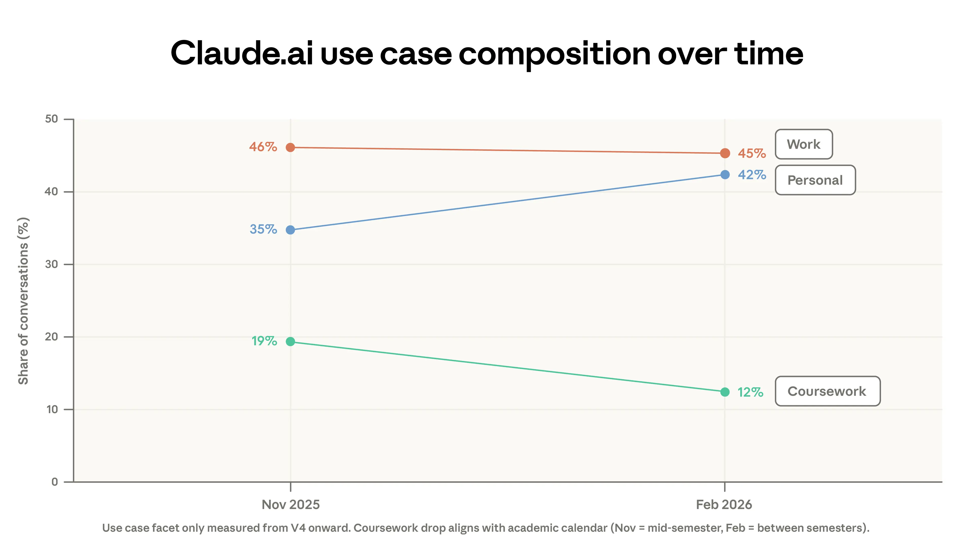 This migration of code out of Claude.ai is not the only factor driving decreased concentration. Part of the drop is due to changes in the mix of use cases between the two periods. Coursework fell from 19% to 12% of conversations, while personal use rose from 35% to 42% of conversations. Some of the drop in coursework can be explained by academic calendars in countries where students were on winter break during our sample period.4 At the same time, increasing signups beginning around February brought more casual AI users.