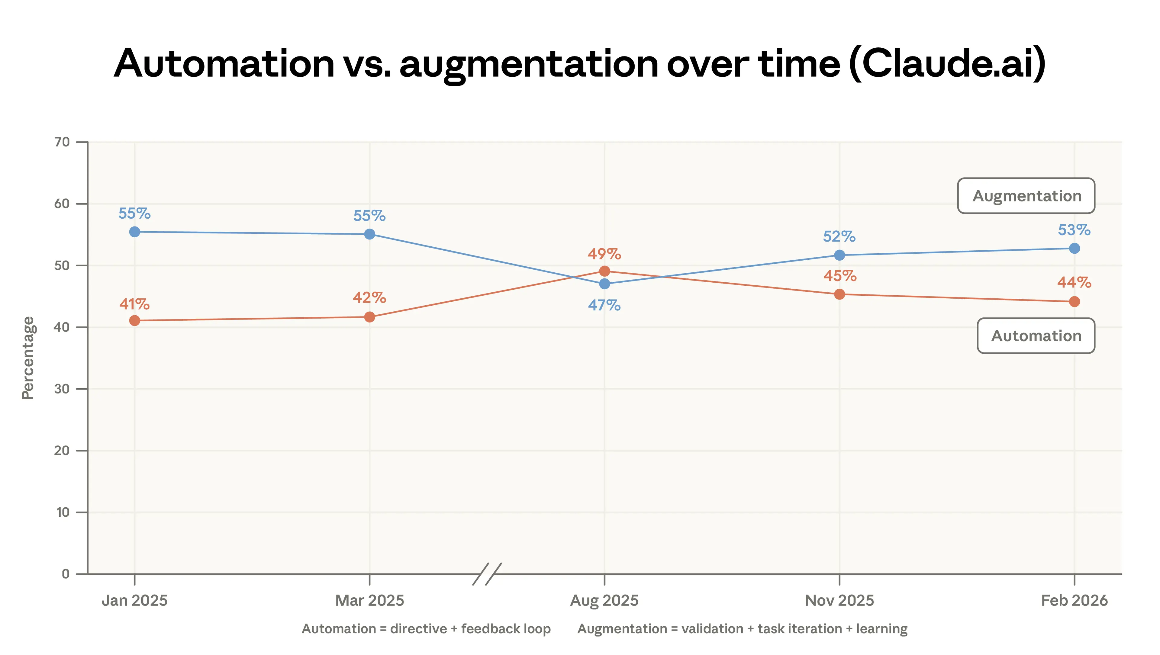 Since our first report, we have classified conversations into one of five interaction types—directive, feedback loop, task iteration, validation, and learning—which we group into two broader categories: automation and augmentation.5 Figure 1.3 shows that augmentation in Claude.ai increased slightly. This was driven by small bumps in validation and learning patterns. In Appendix Figure A.3, we show that automation decreased sharply in the 1P API data.