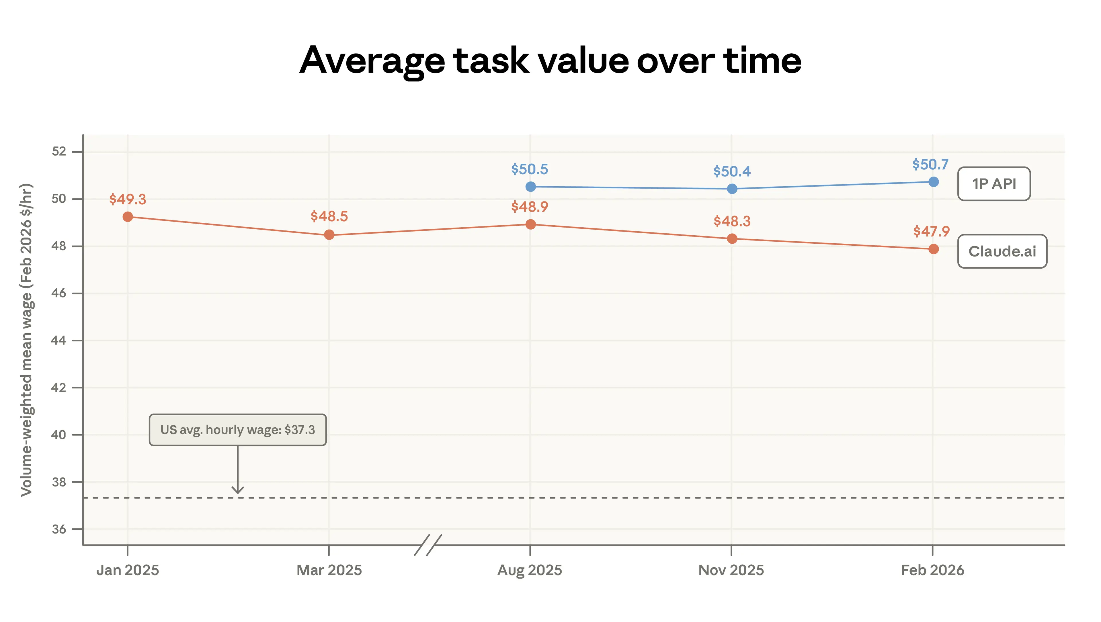 Another way to measure the change in the mix of tasks done on Claude is to look at the change in the average value of tasks, which we define as the average hourly wage of US workers who perform that task (FIgure 1.4).6 This estimate of the value of tasks in Claude.ai has dropped slightly from $49.3 to $47.9 mostly due to an increase in simple factual questions (e.g., sports outcomes, weather) and a decrease in coding as it shifts to the API. As mentioned in our previous report, the tasks we see on Claude tend to require higher education. The plot shows that these tasks also tend to earn higher wages than the US national average.