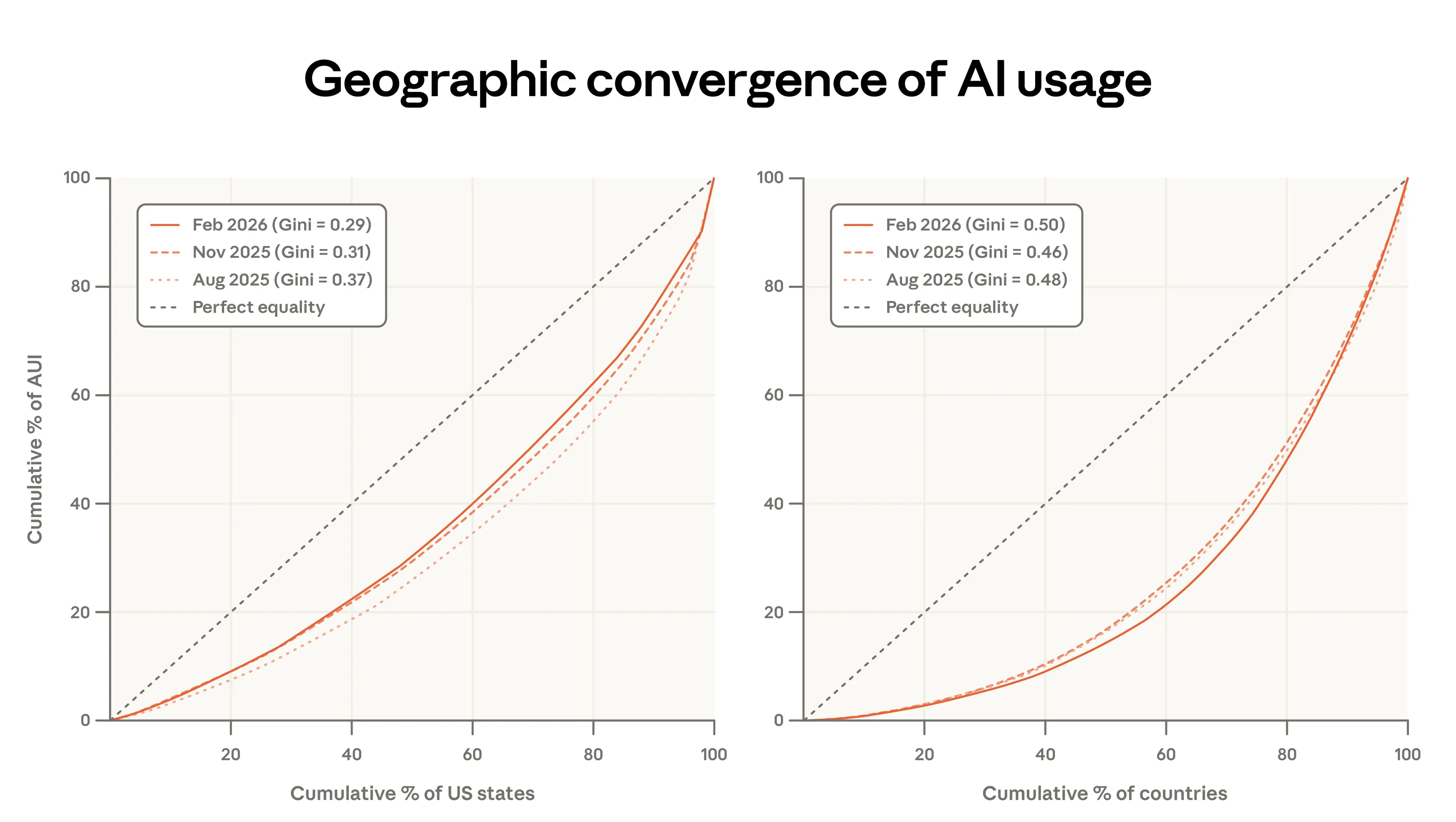 Across countries (right panel), the pattern is reversed: usage has become slightly more concentrated, with the Gini rising over the same period. The countries using Claude the most (per capita) now account for a larger share of overall usage, with the top 20 countries going from 45 to 48% of usage adjusted for population.