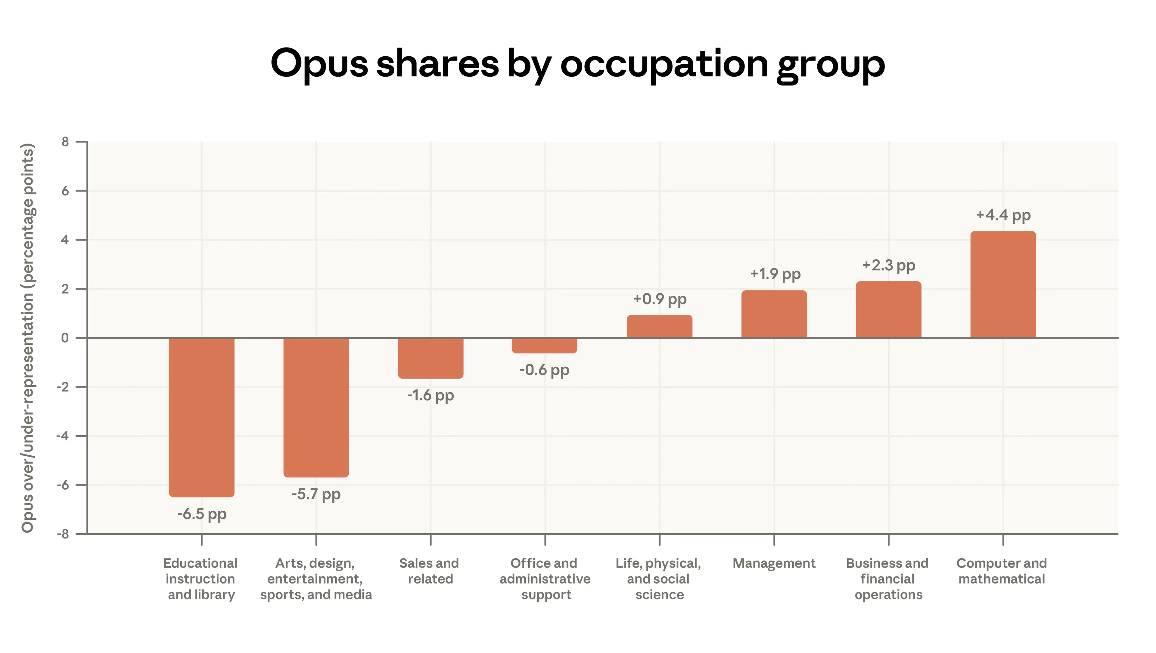 Figure 2.1 below shows that, for paid Claude.ai accounts, which have access to all model classes, 55% of Computer and Mathematical tasks (like coding software) use Opus, compared to 45% of Educational tasks. Technical users may notice performance gains and actively switch away from Sonnet, the default. Or efficiency-minded users may learn to use Sonnet for simpler tasks to avoid hitting usage limits. Relatedly, the differences here could reflect that most educational tasks are already fairly easy for Sonnet, or that students are more likely to be mindful of usage limits.
