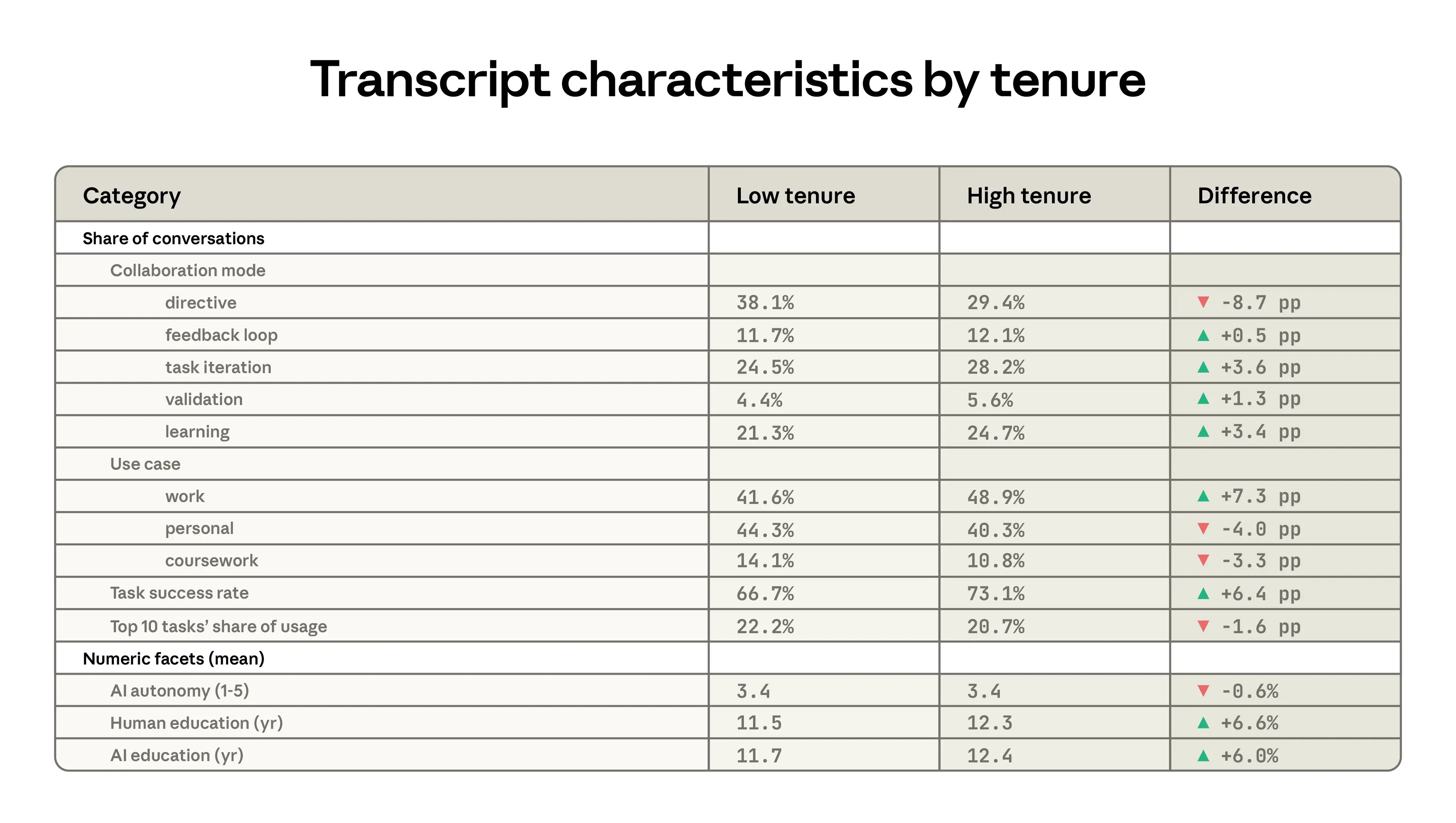 - Higher tenure, higher success. In general, the most seasoned Claude users employ it more often for higher-education tasks and less often for personal use cases. For example, people who have been using Claude for 6 months or more have 10% fewer personal conversations and a 6% higher education level reflected in their inputs. Most strikingly, people in this higher-tenure group have a 10% higher success rate in their conversations, an association that is not explained by their task selection, country of origin, or other factors. While this could reflect sophistication of early adopters, it could also be evidence of learning-by-doing, where people get better at using Claude through experience.